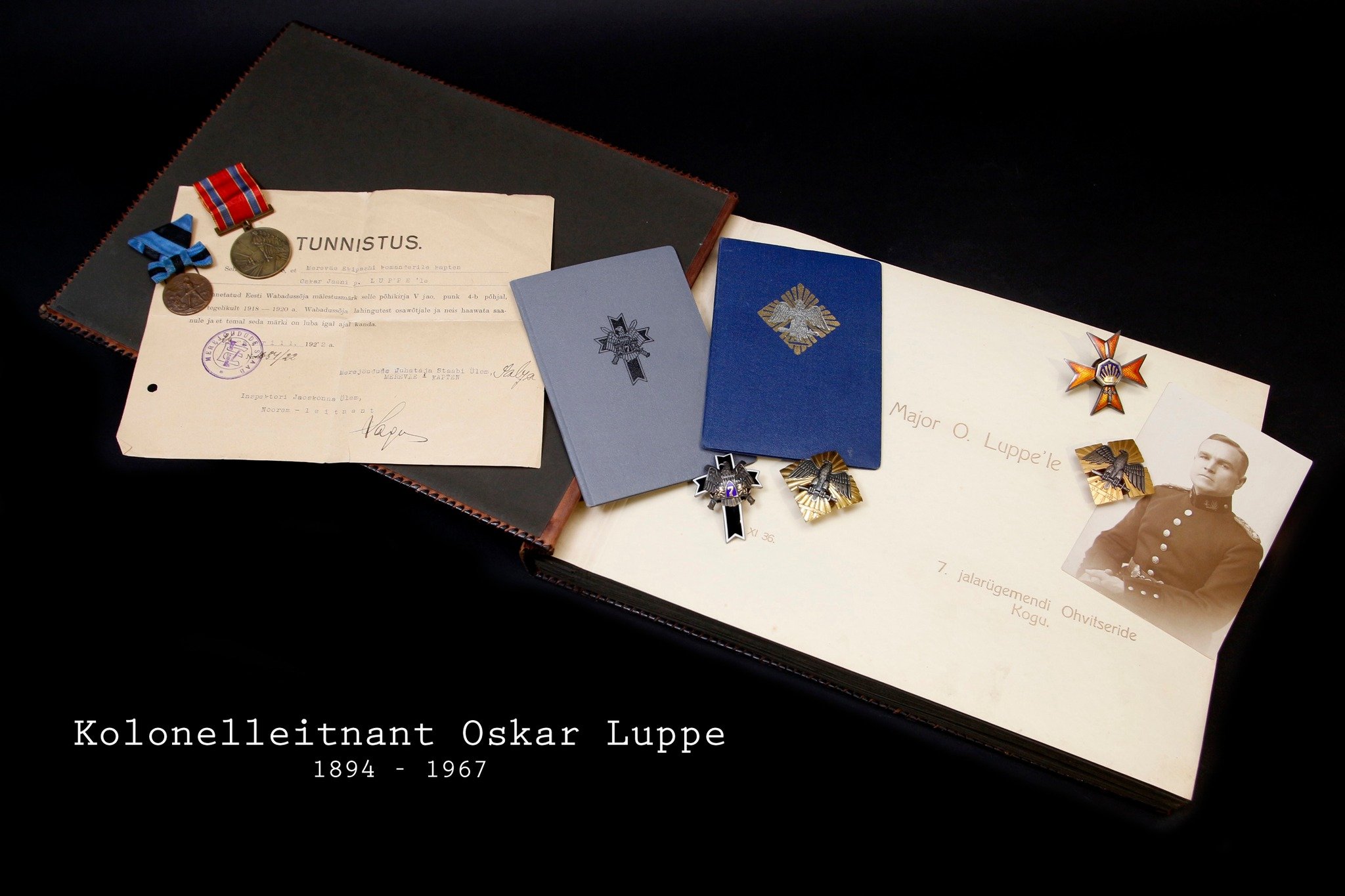 Kolonelleitnant Oskar Luppe komplekt - Vahipataljoni ja 7. jalaväerügemendi rinnamärgid koos tunnistustega, Roman Tavast'i töökojas valmistatud Vahipataljoni rinnamärgi näidiseksemplar, Eesti Vabadussõja mälestusmedal koos tunnistustega, Läti 7. Sigulda jalaväepolgu rinnamärk ja medal "10 aastat Läti Vabadussõjast". Fotoalbum kingiti temale 7. jalaväerügemendist lahkumise puhul 1936. aasta novembris.