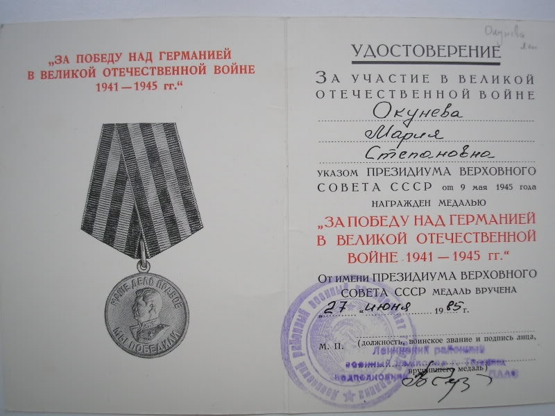 Maria Okuneva oli telefonist. Läks sõtta 21 aastasena 1942. aastal. Mingil põhjusel sai tema oma medali kätte alles 1985. aastal.