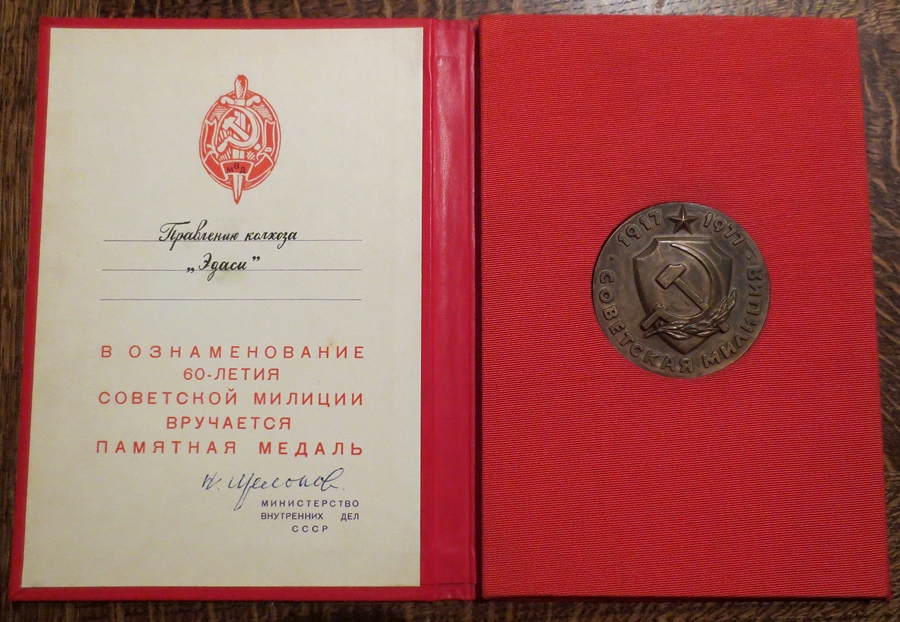 Nikolai Štšelokov’i (NSVL siseminister 1966-1982) poolt Edasi kolhoosile kingitud massiivne pronksist medal. Dokumendil näha olev allkiri on originaal.