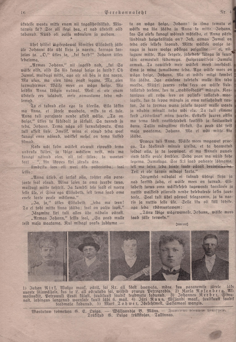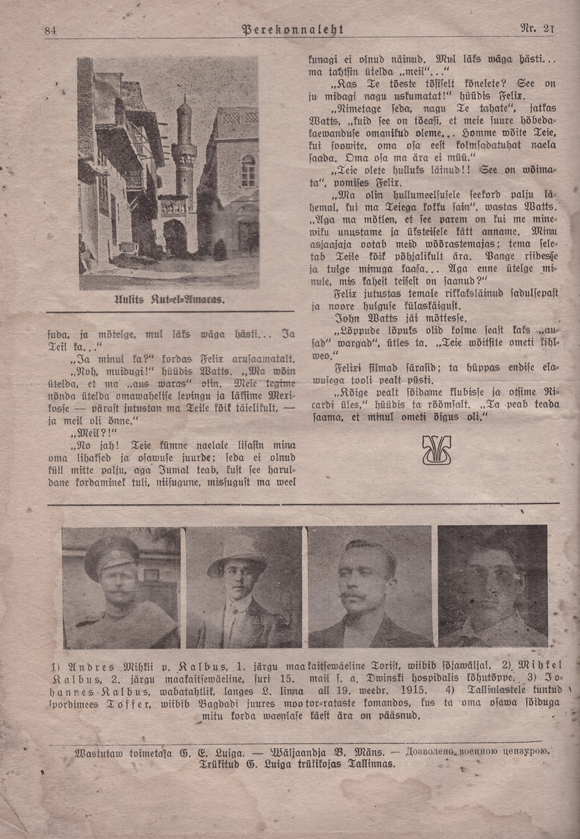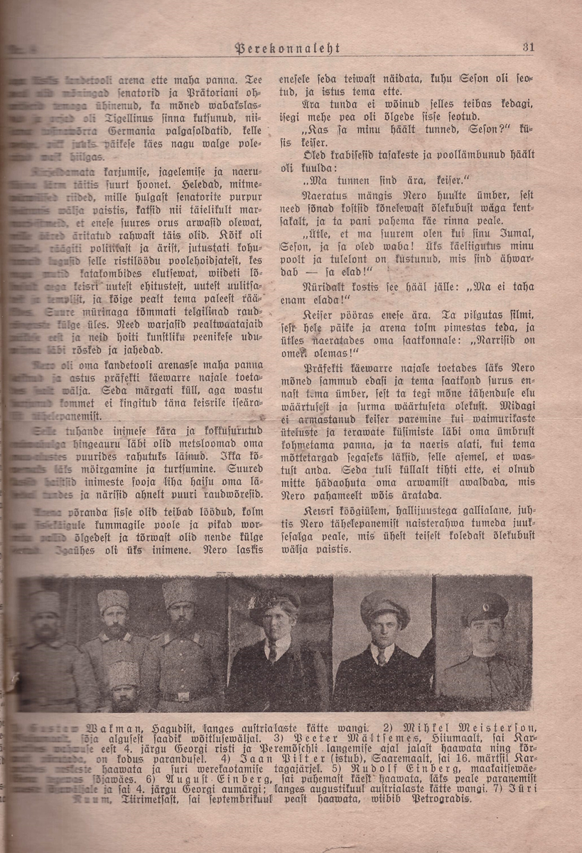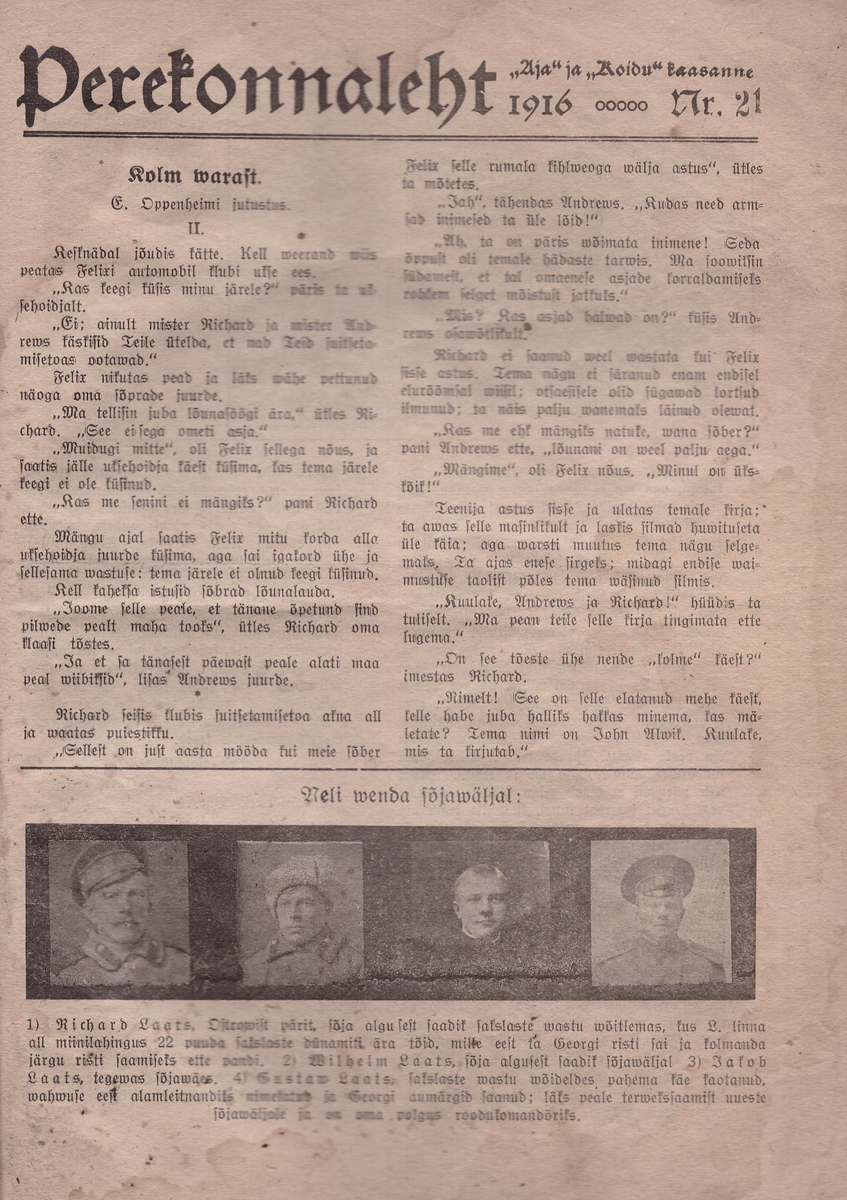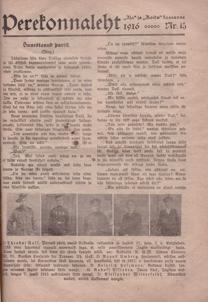 Kuni 1915. a. oli Perekonnaleht ka Päevalehe lisa (tiitel ongi Päevalehe, Aja ja Koidu hinnata kaasaanne. Lõin huvi pärast paar nr lahti (1915. a. jaanuar). Seal ka sõjameeste pilte. Nii haavata saanuid, muidu silmapaistnuid, kui ka lahingute ajal kaduma läinuid ning langenuid. 9. ja 16. jaanuari nr-tes on koguni kiri saksa sõjavangist koos saadetud fotodega.