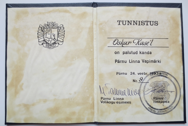 Pärnu linna vapimärk, koos dokumendiga. Välja antud 93. aastal Oskar Kasele, kes oli Vabadussõja veteran. 1993. aasta oligi esimene aasta, mil neid vapimärke välja andma hakati, üldse anti 93. aastal välja 10 märki ja seda alljärgnevalt:
