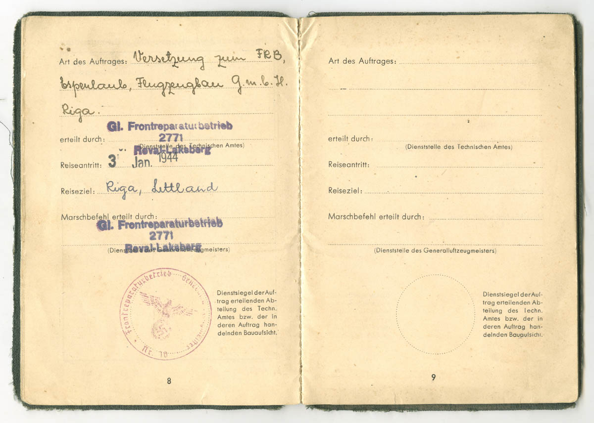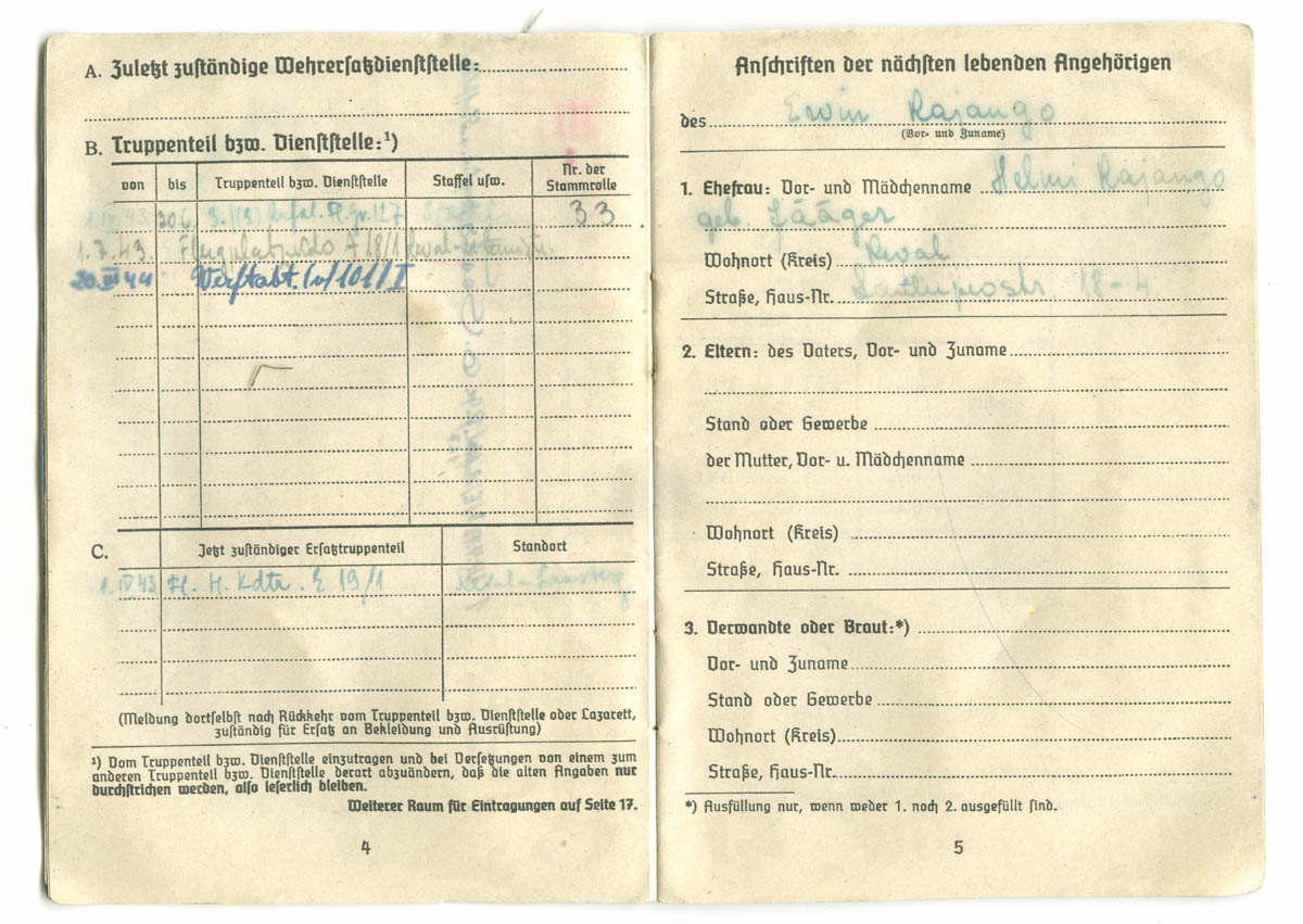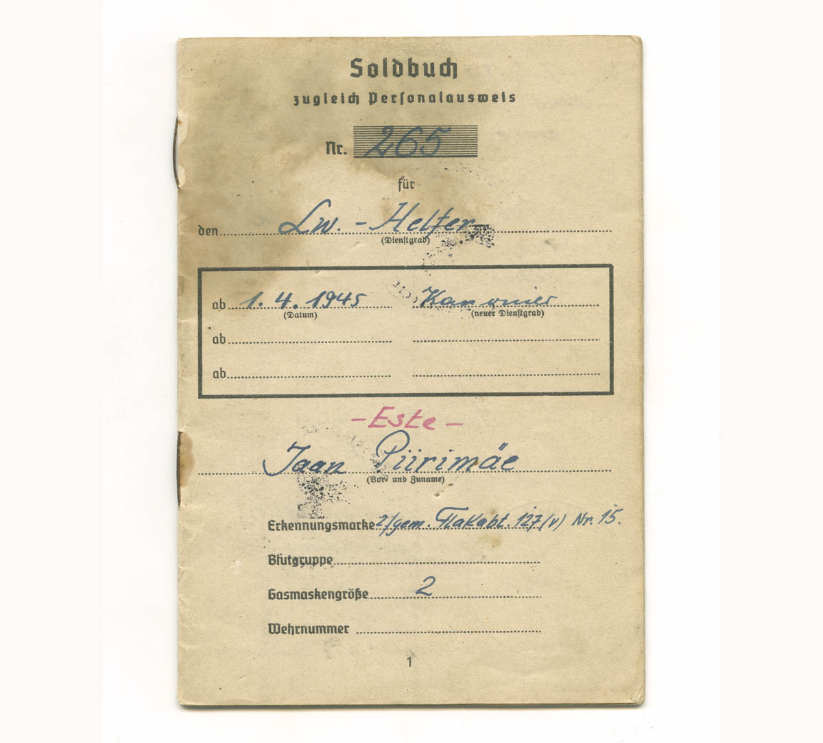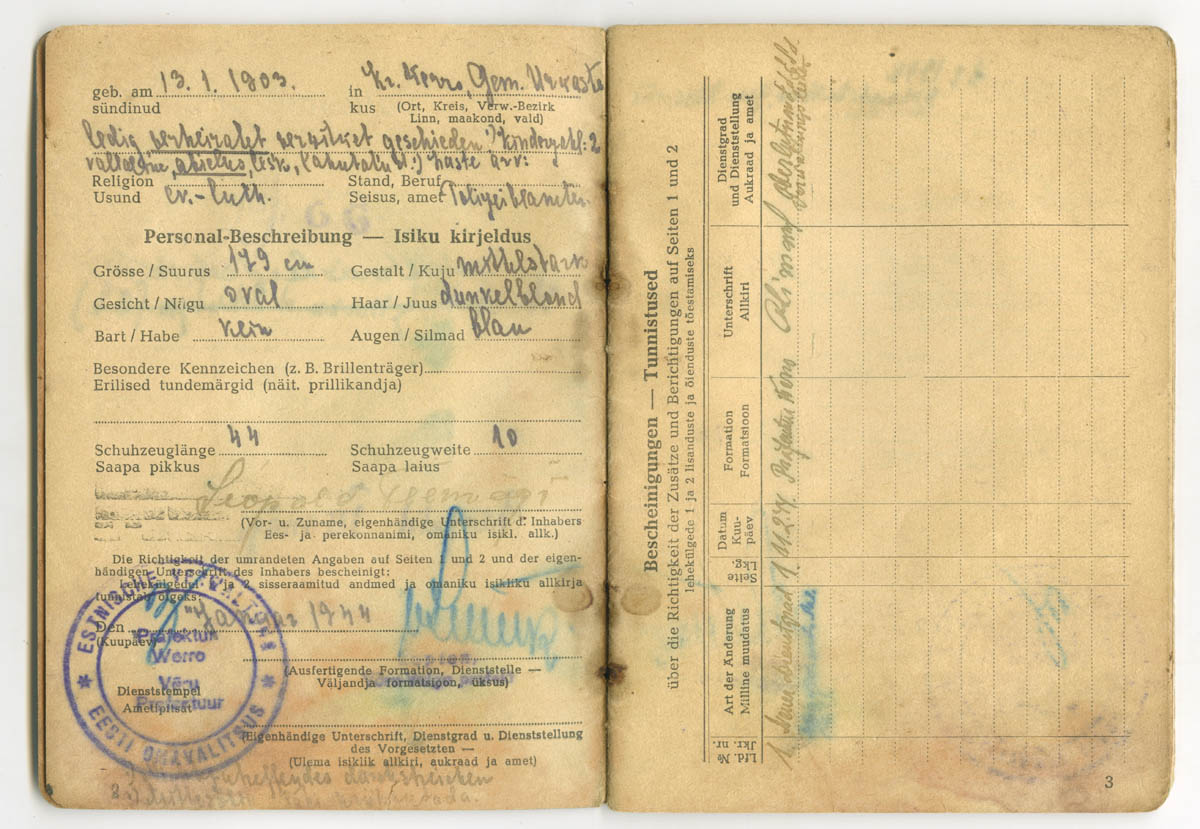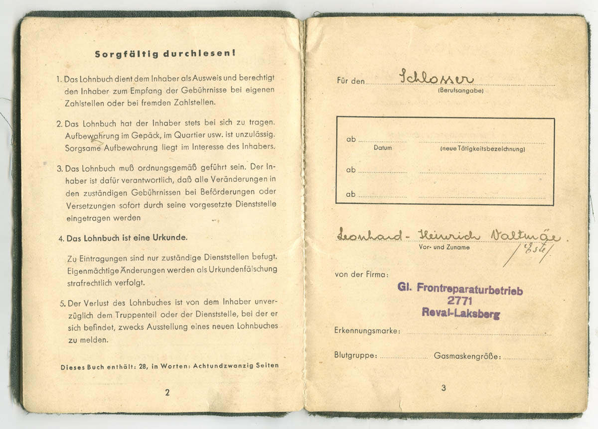 Teema on küll Soldbuch'idest aga postitan siia siiski lisaks ka ühe eestlase Lohnbuch'i, mis on kuulunud kasutaja nublu poolt mainitud organisatsioonis ametis olnud mehele.nublu kirjutas:Algul oli seal sakslaste tsiviilremondiorganisatsioon Frontreparaturbetrieb GL Reval Espenlaub, see kolis siit aga 1943. a. sügisel Riiga. Siis avati samades ruumides puht sõjaväe ettevõtmine Werftabteilung 101/I (kus I seal lõpus näitab jällegi Luftflotte I allumist), mille ülemaks sai senini Ülemistel lennukite remondiga tegelenud Herbert Joari. Ilmselt kolis sinna Werftabteilungisse üle enamus Espenlaubi kohalikke töötajaid ning nagu näha - mõned mehed ka Ülemistelt.
