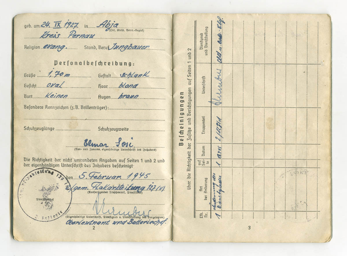 1927. aastal sündinud Elmar Sosi mobiliseeriti 1944. aasta augustis ja määrati koos paljude teiste 1927. aastal sündinud Pärnumaa poistega 127. Flak Abteilung'i koosseisu. E. Sosi sattus üksuse 2. patareisse, mis oli (kui ma nüüd ei eksi) raskepatarei ja relvastatud 88 mm õhutõrjekahuritega. 1944. aasta septembris liikus ta koos oma üksusega Lätti, kuhu jäi kuni sõja lõpuni. 1945. aasta 8. mail õnnestus sealt üksusest seitsmel eestlasel põgeneda Rootsi. 1946. aastal 25. jaanuaril andis Rootsi valitsus nad venelastele välja. LW Helfer / Kanonier Elmar Sosi oli üks seitsme hulgast.