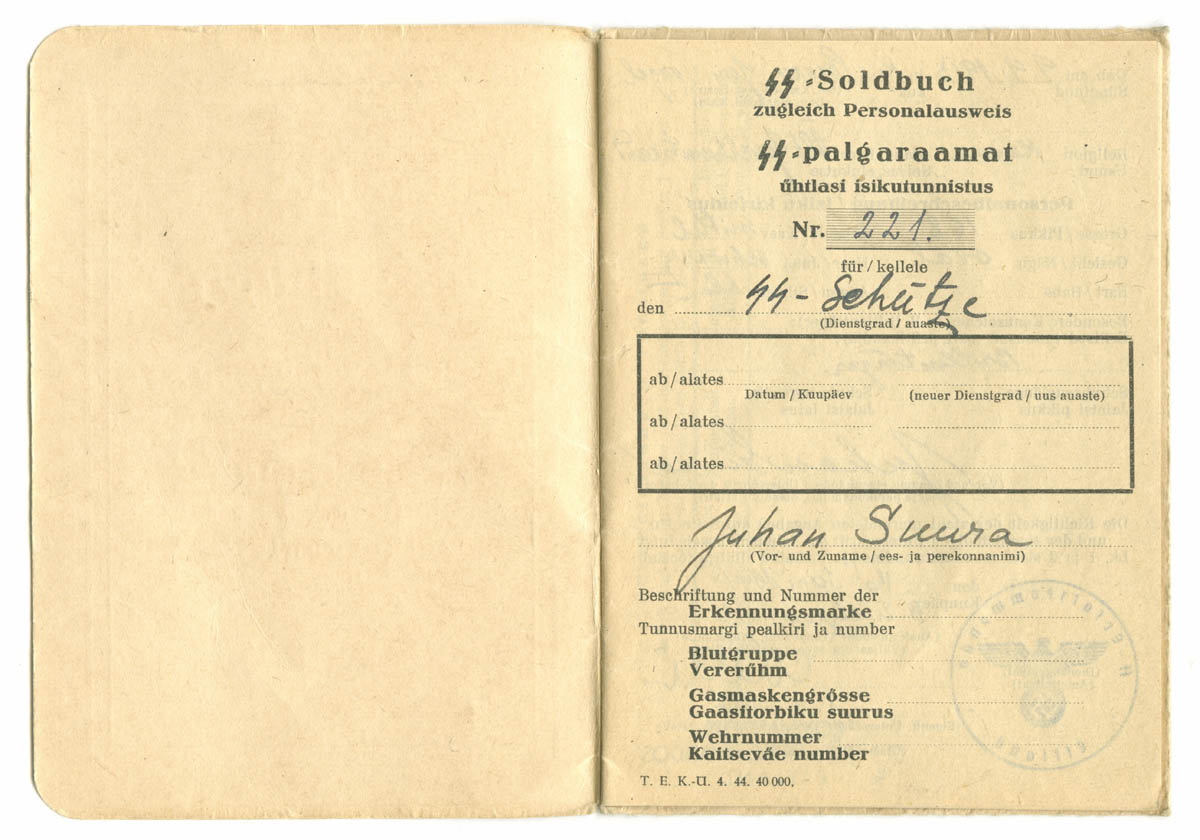 See palgaraamat on välja kirjutatud SS-Ersatzkommando Estland Pärnu Kaitseväeringkonna teenistuses olnud reamehele Juhan Suura'le. Soldbuch'i huvitavamad detailid on mõned ilusad templid ja paar allkirja, mille autor peaks olema Sturmbannführer Ain Mere.