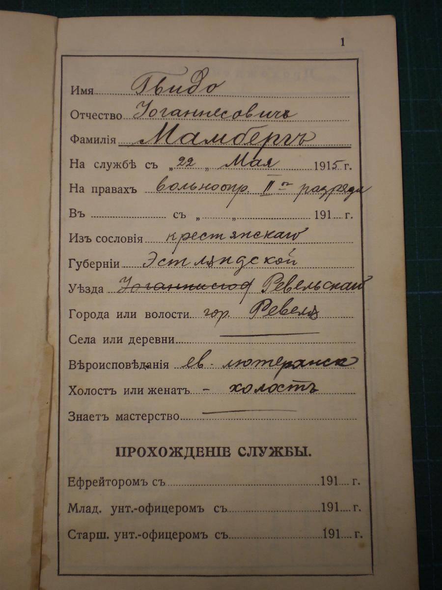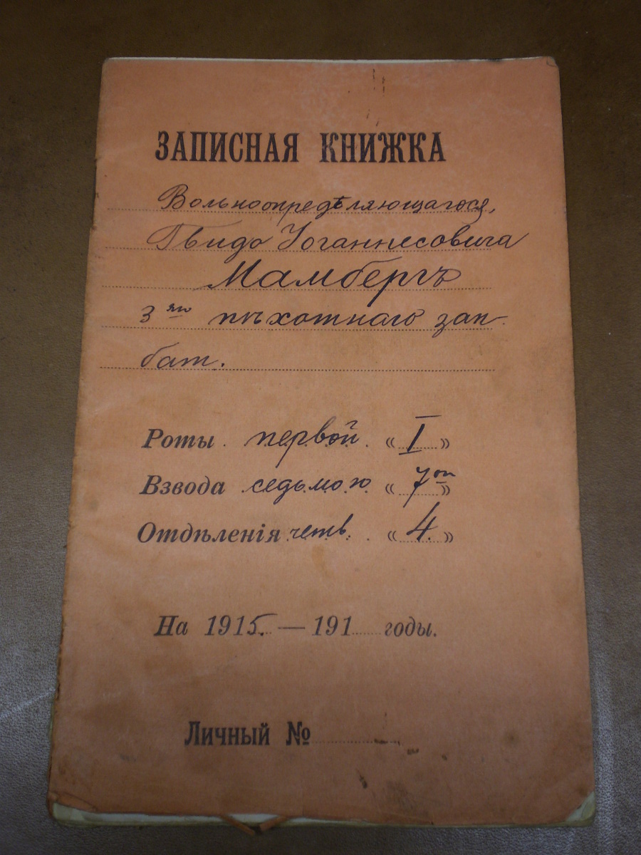 SEE G.Mambergile kuulunud tsaari aegne sõjavae.varustuse pass on minu leitud kunagi Nõmmelt majast ,kus ta elas. pööningul oli palju paberi kraami,igasugu purgi ettikette ja plakateid,Eesti või ja esto sigadega.vene aeg sai need üle Eesti raamatukogudesse maha müüdud.varustus paberid sai Nõmme antiigi kokkuostjale müüdud.