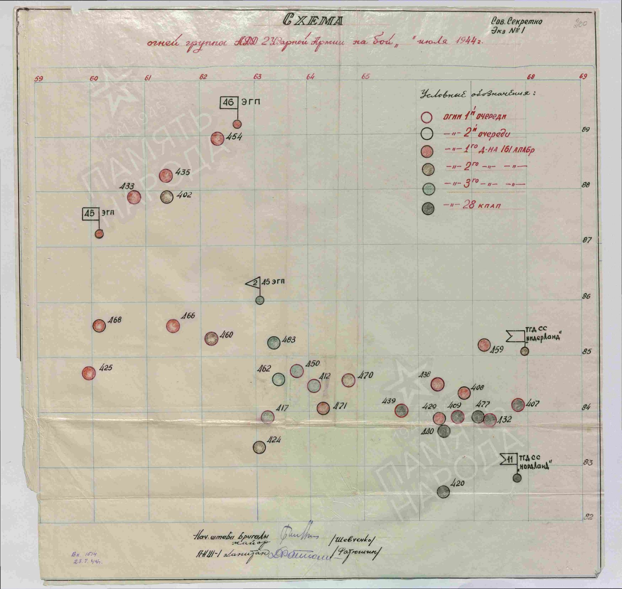 2. löögiarmee kaugtegevussuurtükiväegrupi sihtmärkide skeem seisuga 23.07 (ringid on suurtükkide grupid, lipukestega ringid - staabid). Kuna Saksa staapide ja suurtükipatareide täpne asukoht kaardil on reeglina täpselt teadmata, siis on ka raske hinnata, kuivõrd täpne see skeem on.