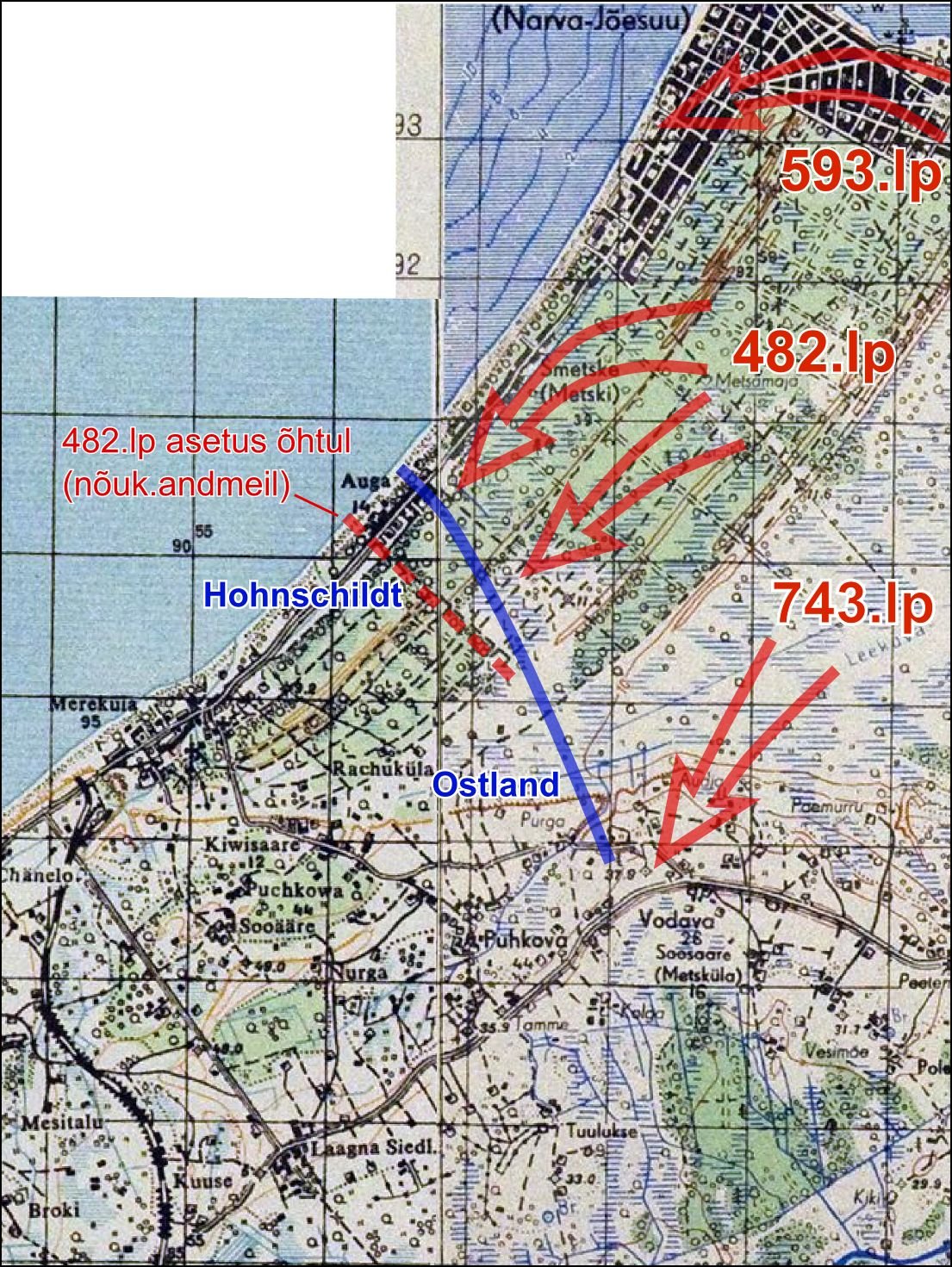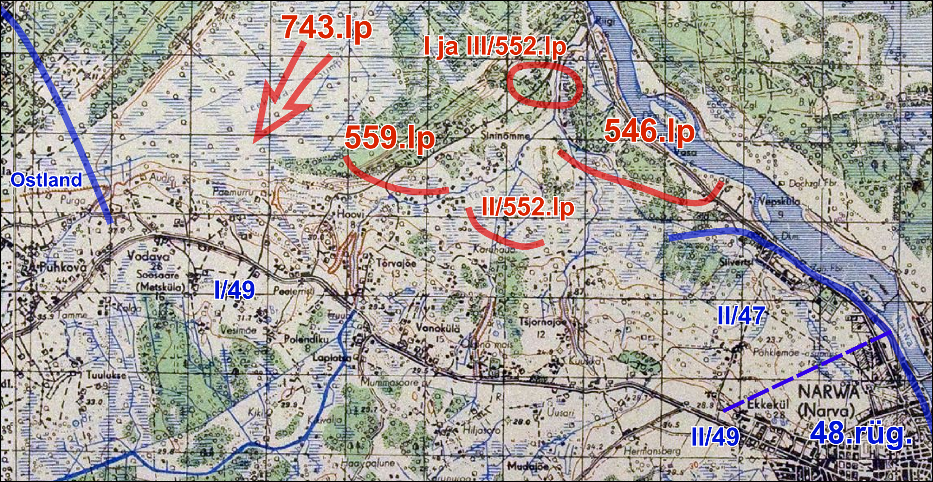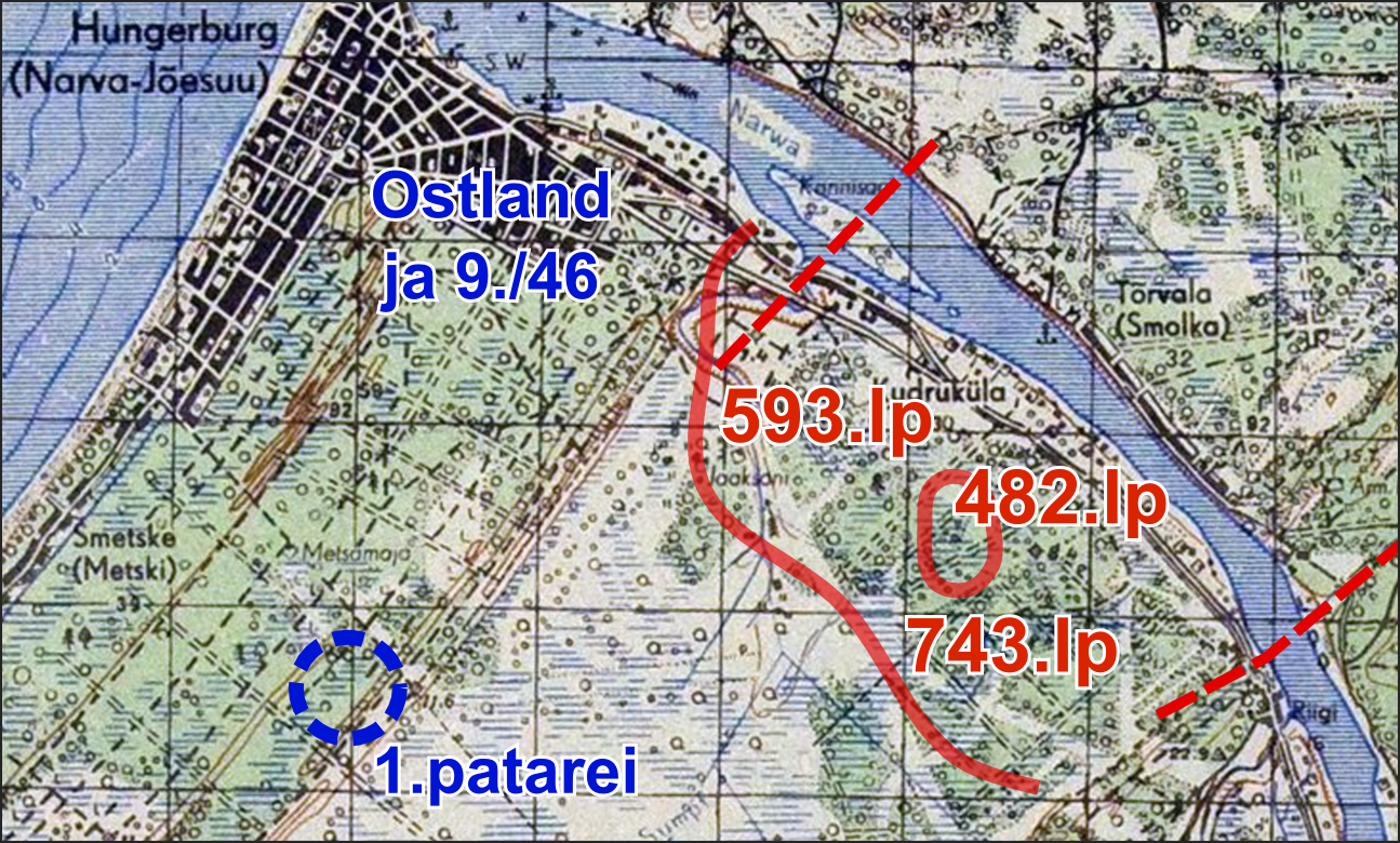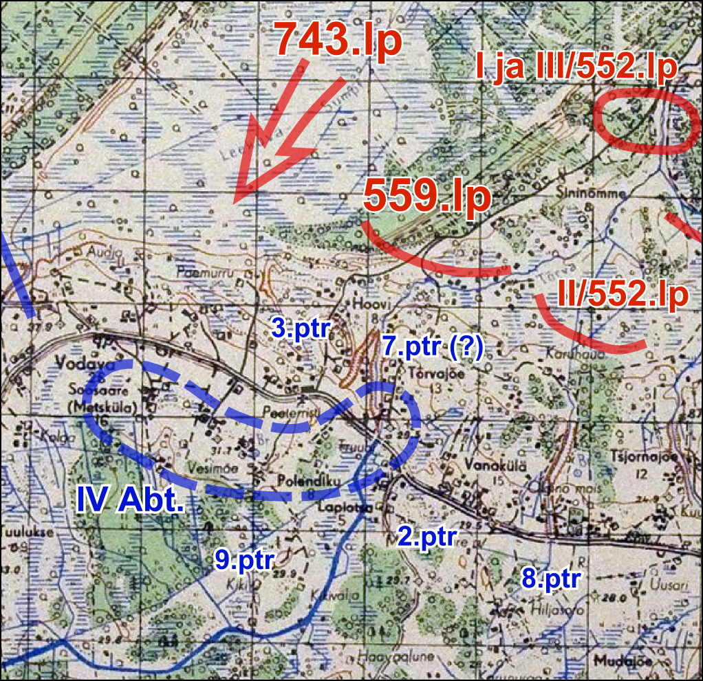 A brief addition on my part: I interviewed Ustuf. Endel Balder (VB 7./Art.Rgt.20) many years ago, who mentioned to me that he had his VB-post in the Riigiküla area. On the evening of 24.7 he was called to the battery by the battery commander to "taste a bottle of good liquor (schnapps)." When he returned to the Narva River in the morning of the following day, the Russians launched the attack, and he said that the whole area looked like an inferno and that the Russians had a very good idea of where the Estonian positions were located.