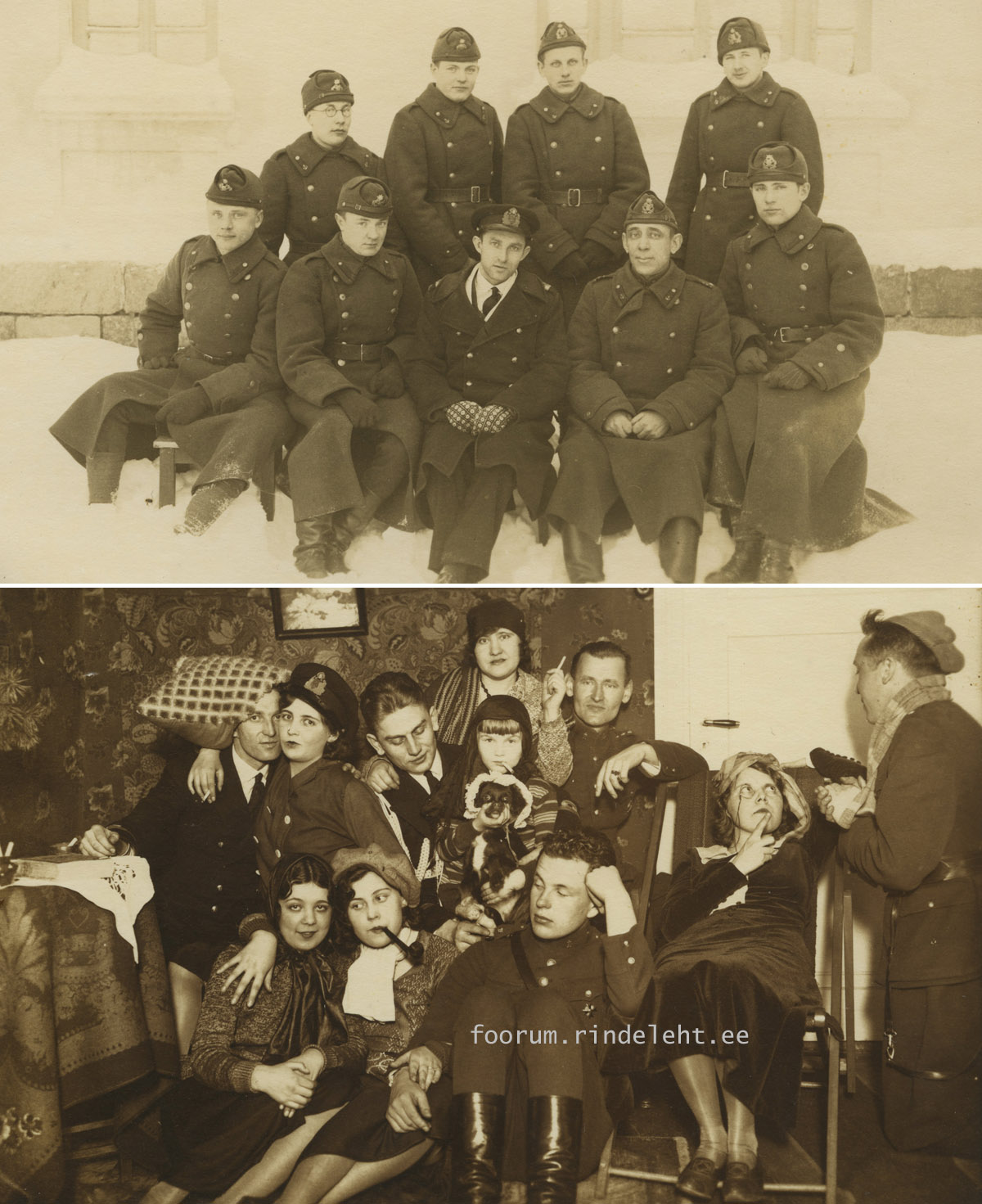 Ülemisel pildil istub keskel leitnant Rudolf Hiiesaar, sama mees on teisel pildil vasakul (padi peas).