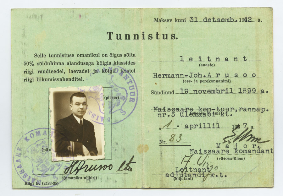 Viimati postitatud piltidest esimesel istub ees reas teiste hulgas ka Rannapatarei Nr. 5 ülema abi kohusetäitja leitnant Hermann Johannes Arusoo. Lisan temale väljastatud riigi liikumisvahenditel sõidusoodustust lubava tunnistuse. Dokumendile on alla kirjutanud Naissaare MK komandant major Elmar Arthur Urm ja adjutant leitnant August Virgo.