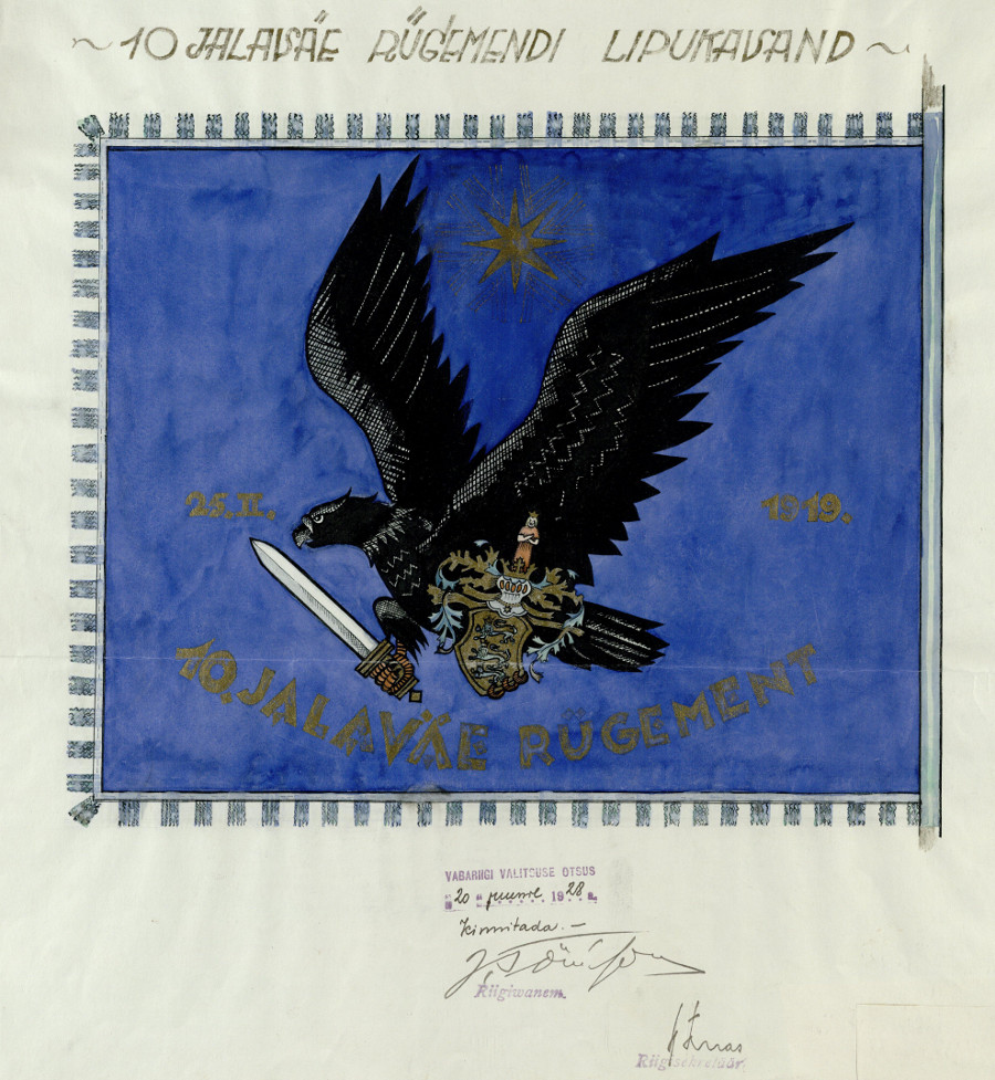 10. jalaväerügemendi lipu kavand nagu see avaldati 14. märtsi Vabas Maas Sama aasta 20. juunil valitsuses kinnitatud kavand