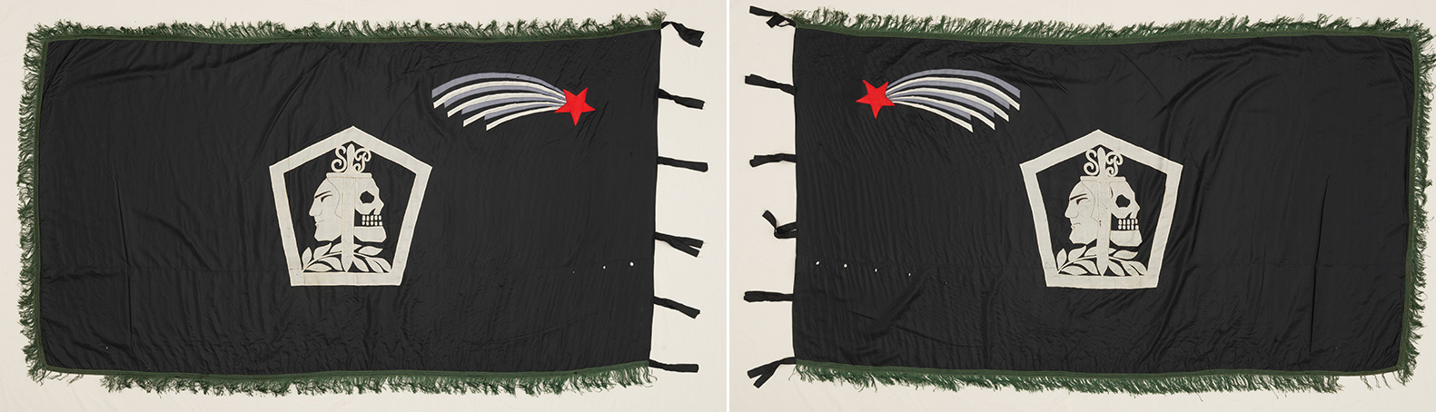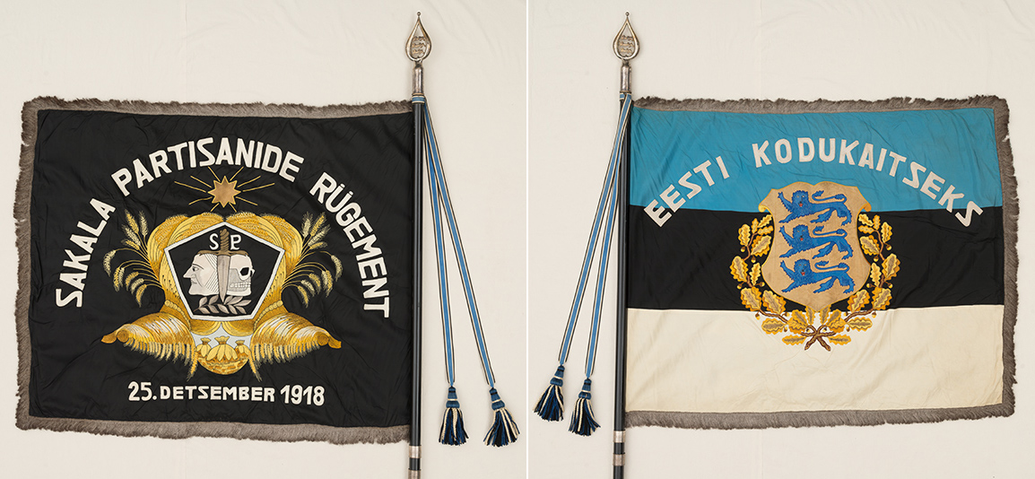 Kolm erinevat Sakala Partisanide Pataljoni lippu - kõik asuvad Eesti Rahva Muuseumis.