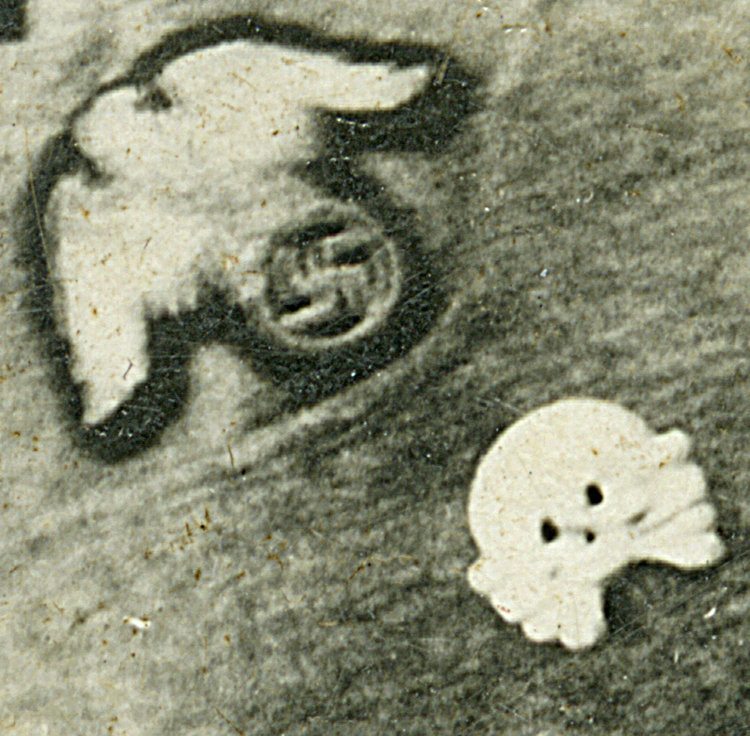 Leegionäride fotodel on näha küll, et metallist mütsimärgid on mõnikord pandud riidest embleemide peale - ilmselt tundus omal ajal uhkem kui on mütsi ees ikka hõbedane metallist pealuu.Või oli see levinud komme?