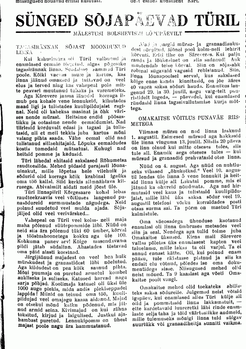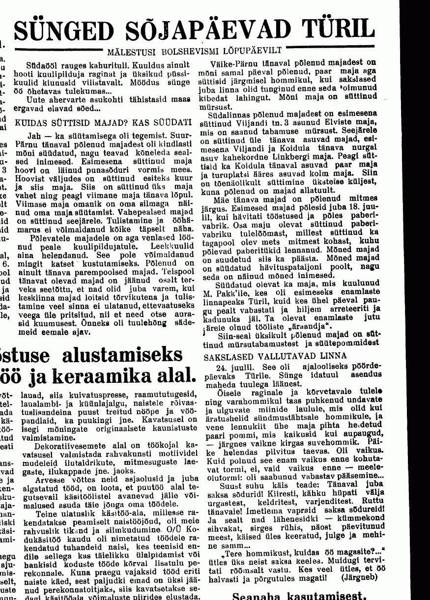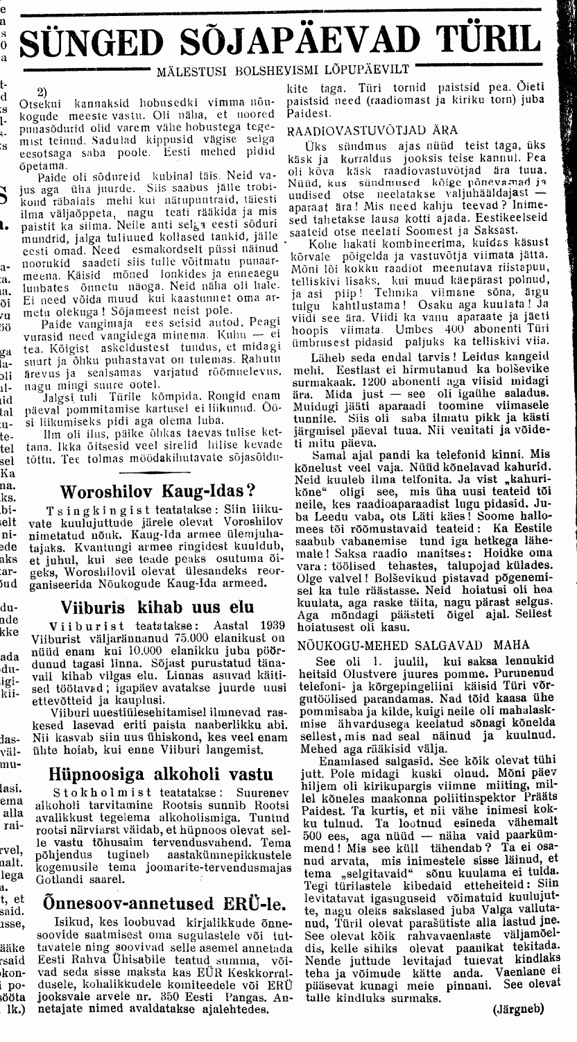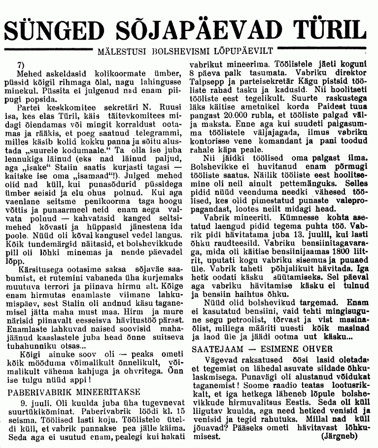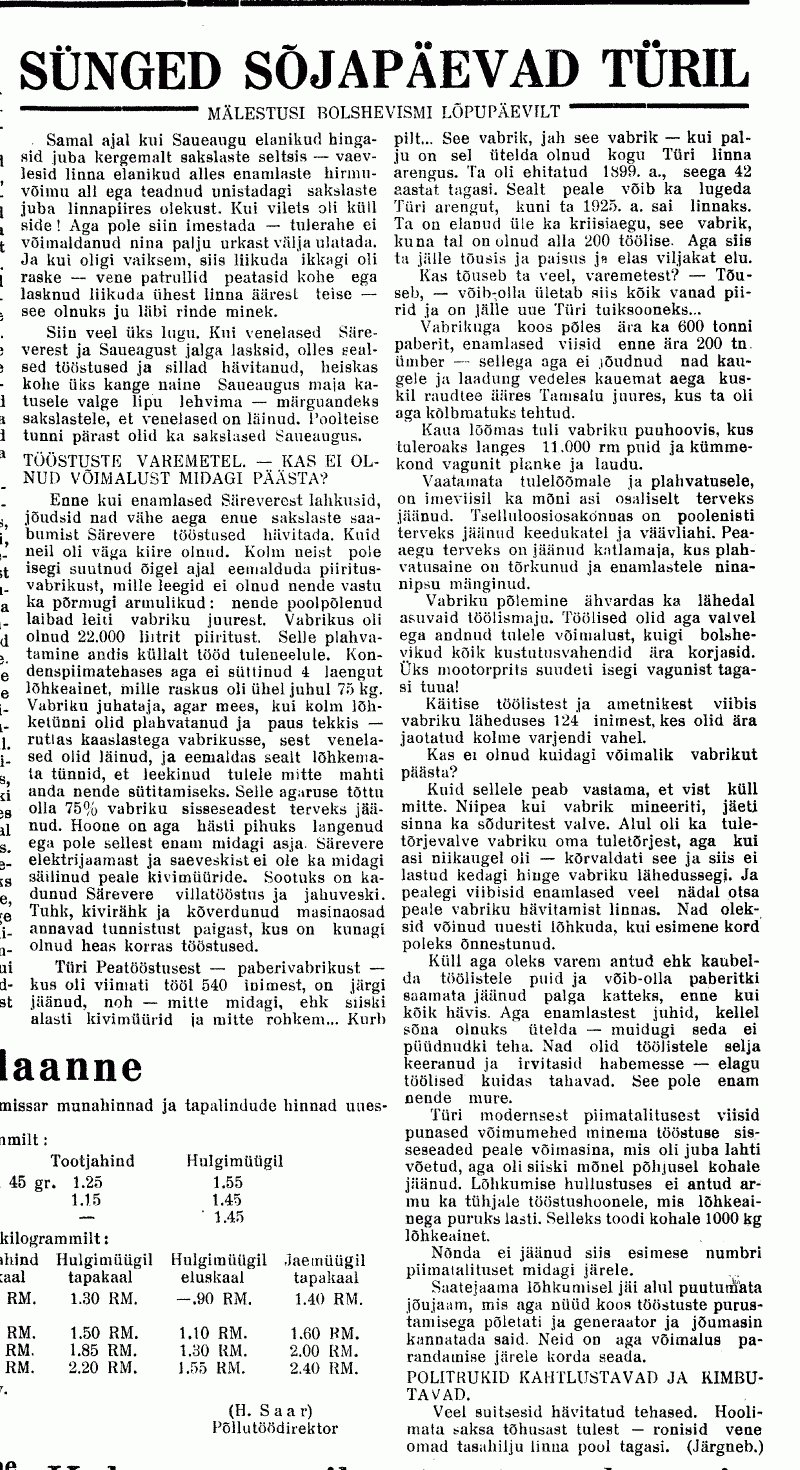 "...Nimekirja järgi otsustades veeti Türilt Venemaale 60 kilohertsine kõrgsagedusvastuvõtja, Marconi saatja juhtkristall, katoodtorud ja mitmesuguseid mõõteriistu (lainemõõtja, ampermeetrid, voltmeetrid) koguväärtuses 29 200 rubla.