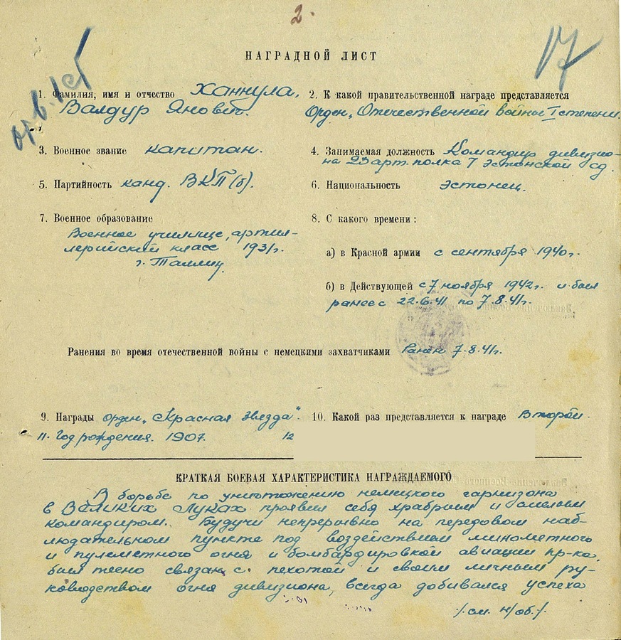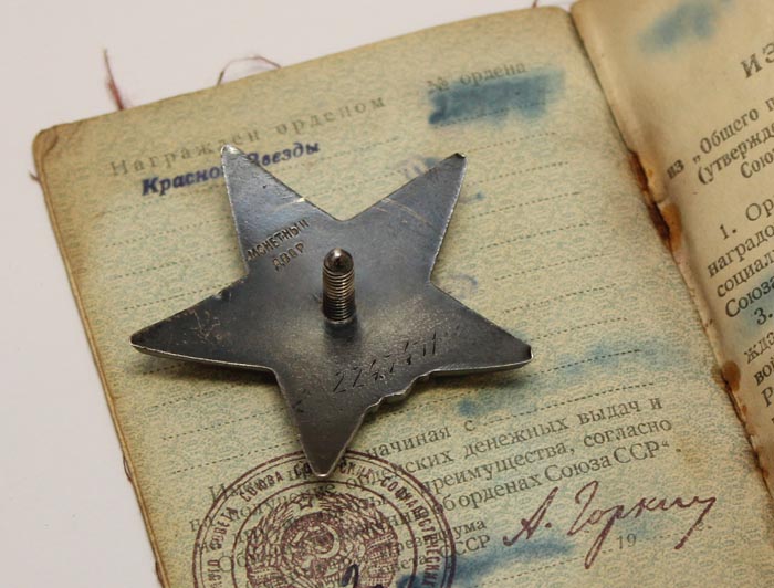 Punatäht on tuttavast Eesti Laskurkorpuse vahemikust, V.V. ordeni number 1 480 646. Dokument kahjuks puudu aga samas tuli Punatähega koos 1985. aasta Isamaasõja orden, millel raamat kaasas ja nimi sees.