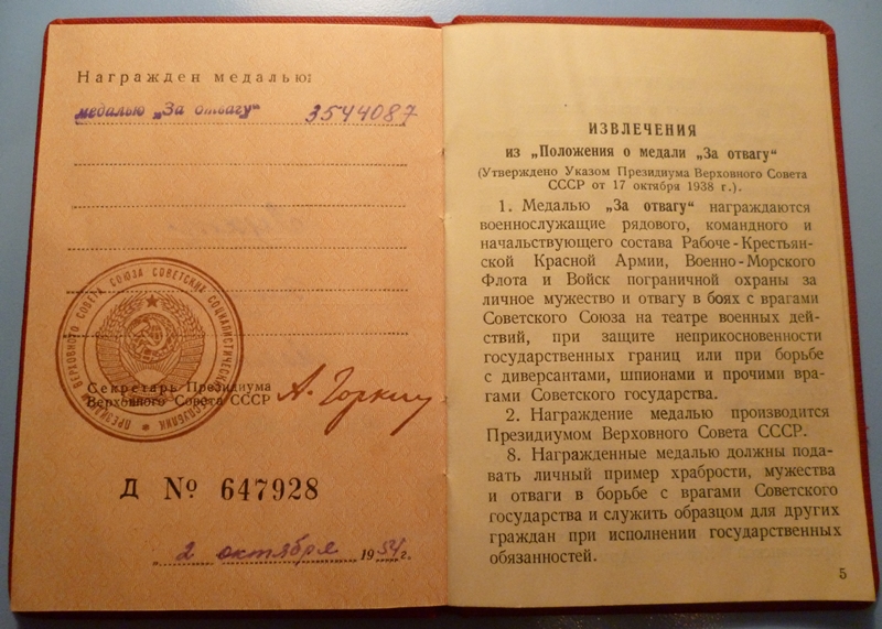 Teine vapruse medal 2402785 saadud vastuluureüksuse SMERSH käsutuses karistusüksuses olles ( ilmselt Kuramaal ), kus peeti erilist hoolt selle üle, et kõik kes peaks on ikka eesliinil ja täidavad oma lahinguülesandeid. Lühidalt siis midagi sellist. Tegelikult esitati ta viimase eest Punatähe ordenile, aga sai Vapruse medali.