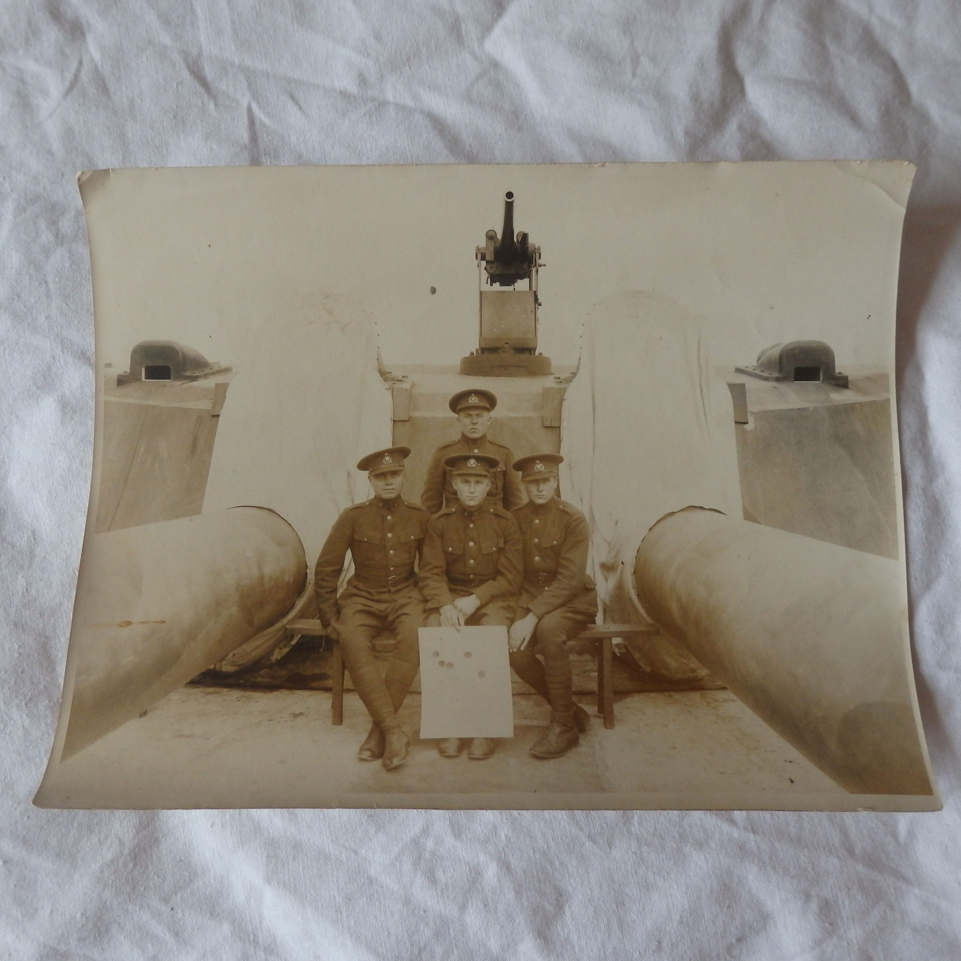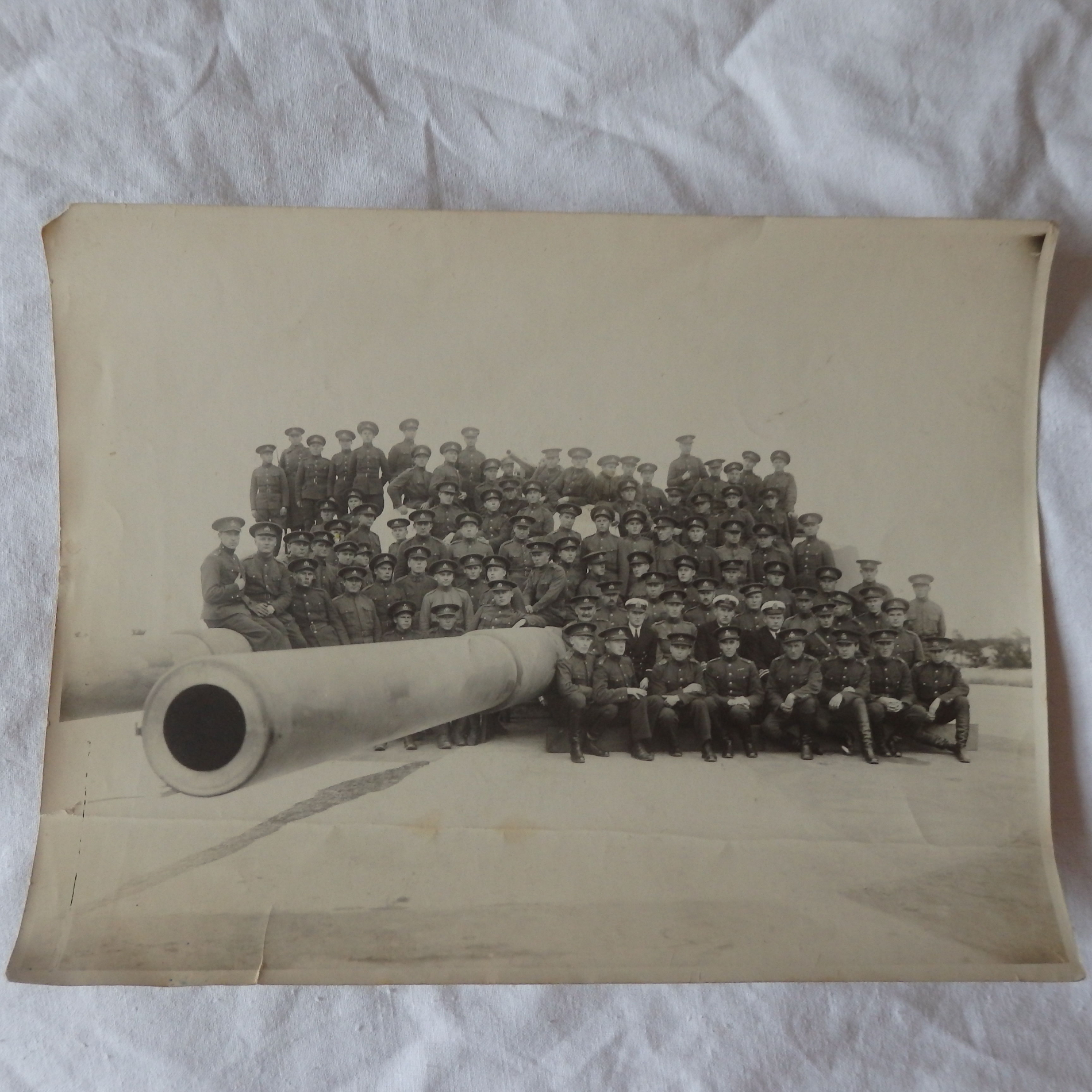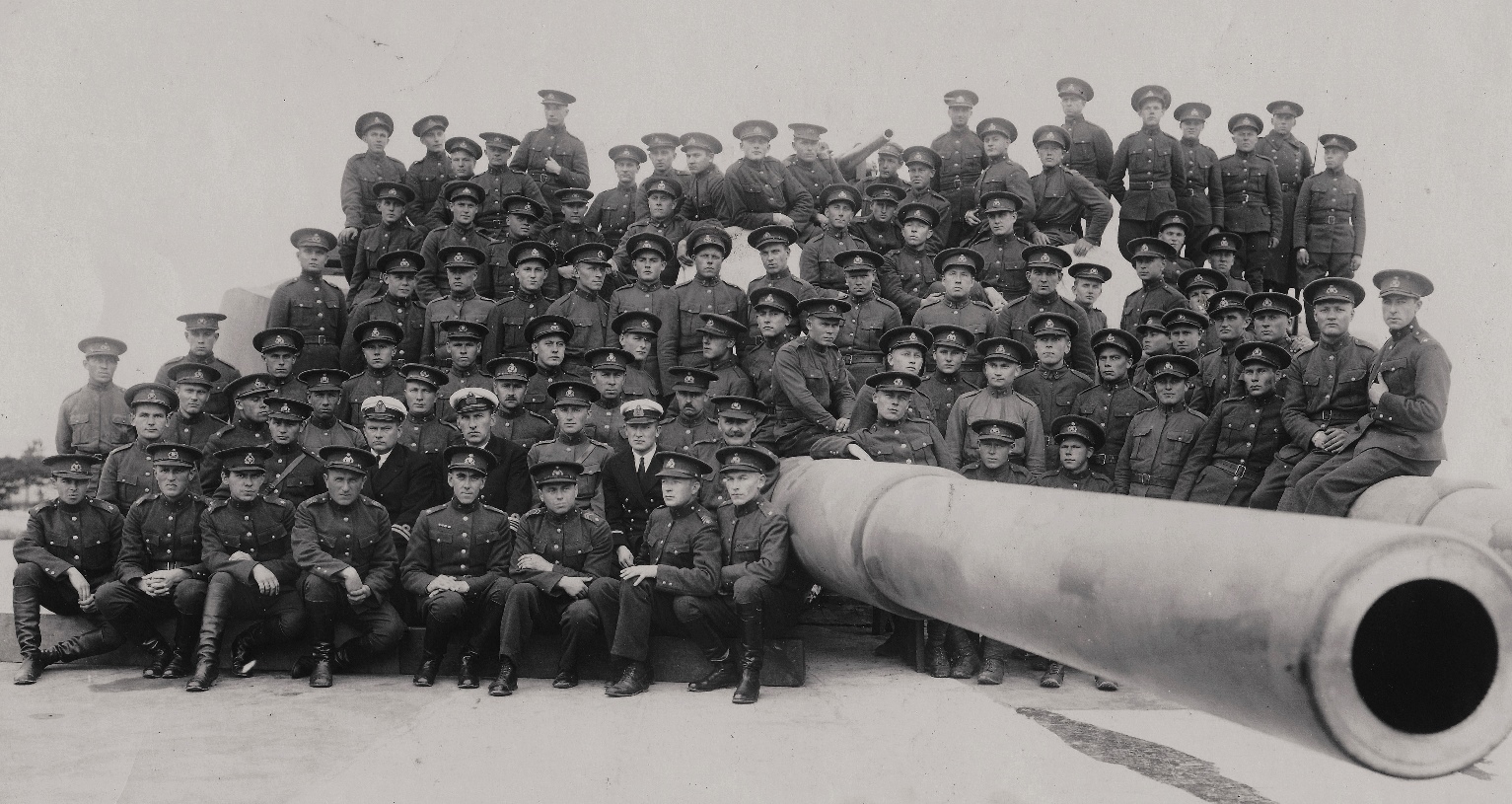 Nägupidi tunnen ära ainult pildi keskel (ilma mütsita) seisva Eduard August Lemming'u ja tema vasakul käel oleva Peeter Kaseoru. Arvan, et enamik nendest härradest, kes Kaseorust vasakule jäävad on Aegna Merekindlusega tutvuma tulnud Sõjakooli aspirandid. Kolmene seltskond pildi vasakus servas on ilmselt Aegna MK koosseisust.