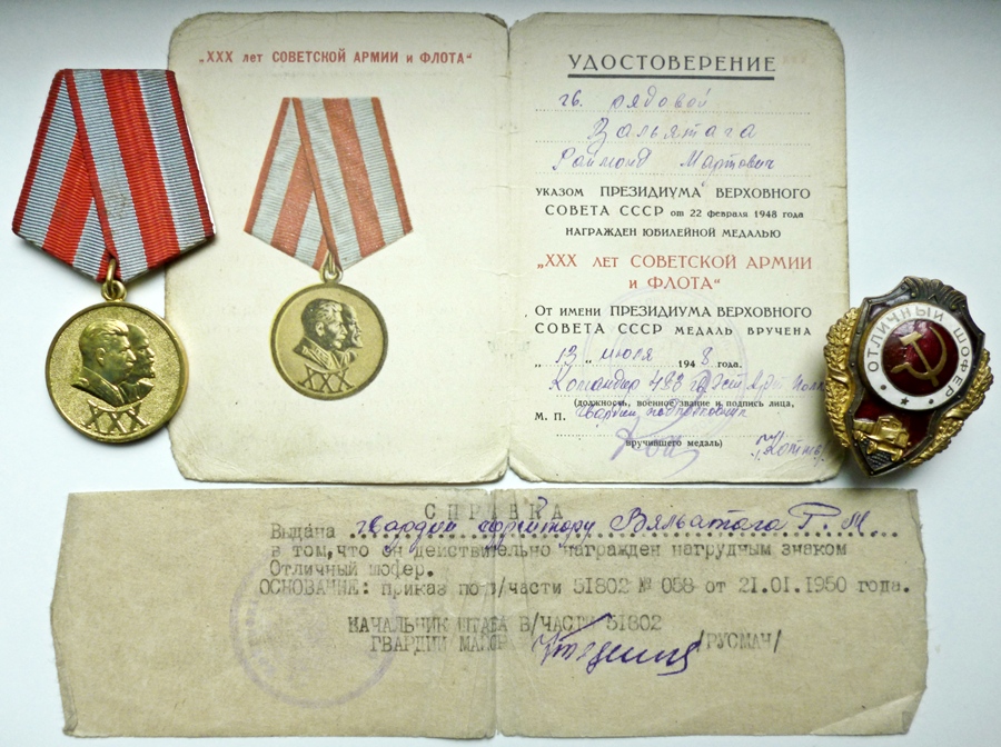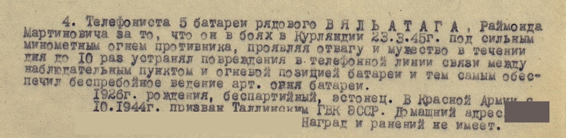 483. suurtükiväepolgu jefreitor Raimond Väljataga. Vapruse medali ( mille sai Kuramaal ) kavaler, kahjuks medalit ennast ei ole. Küll on aga alles medal XXX aastat armeed ja rinnamärk tubli autojuht.