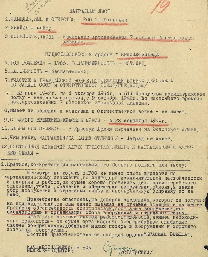 Suvi sai läbi ja hakkame aga vaikselt täiendama. Esimeseks major Roo, Punalipulise, Tallinna nime kandva 7. Eesti Laskurdiviisi suurtükiväe varustusosakonna ülem. Isamaasõja II klassi orden nr. 428629, autasustatud 1945 aastal lahingutegevuse eest Kuramaal.