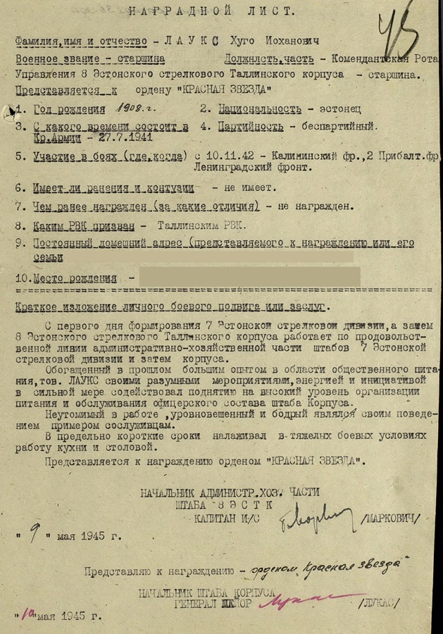 ...selle eest, et lahingus Velikei-Luki äärelinnas? "Valge maja" ründamisel 25.12.42 ilmutas äärmist mehisust ja vaprust. Hävitas vintpüssist 3 fašisti ja õhutas (tekitas?) midagi?? fašistide vastu teistes võitlejates??? (ei saa pihta, mis sõna seal on?) Rünnakule läks alati esimesena haarates endaga kaasa ülejäänud massi. "Valge maja" ründamisel sai raskesti haavata.....