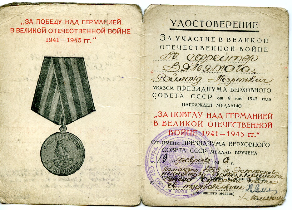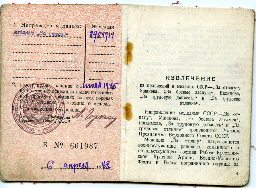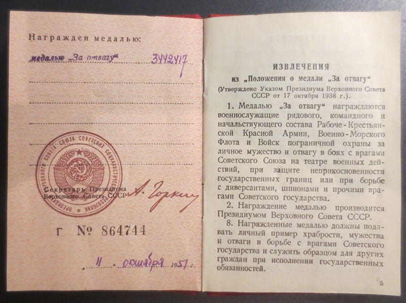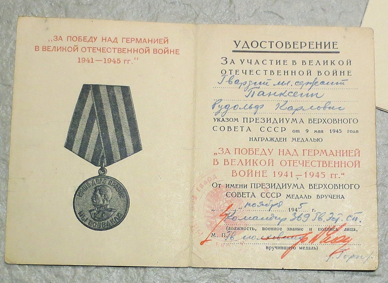 Esimene Punatähe orden (1147049) on saadud Väikese väina forsseerimise eest, teine Punatäht ja Lahinguteenete medal arvatavasti Punaarmees väljateenitud aastate eest.