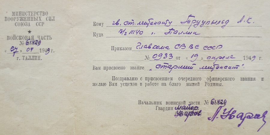 Neljakümnendate lõpust pärit olevas ja kuni viiekümnendate aastate alguseni täidetud NA ohvitseri varustuseraamatus on ta auastmeks aga juba nooremleitnant.
