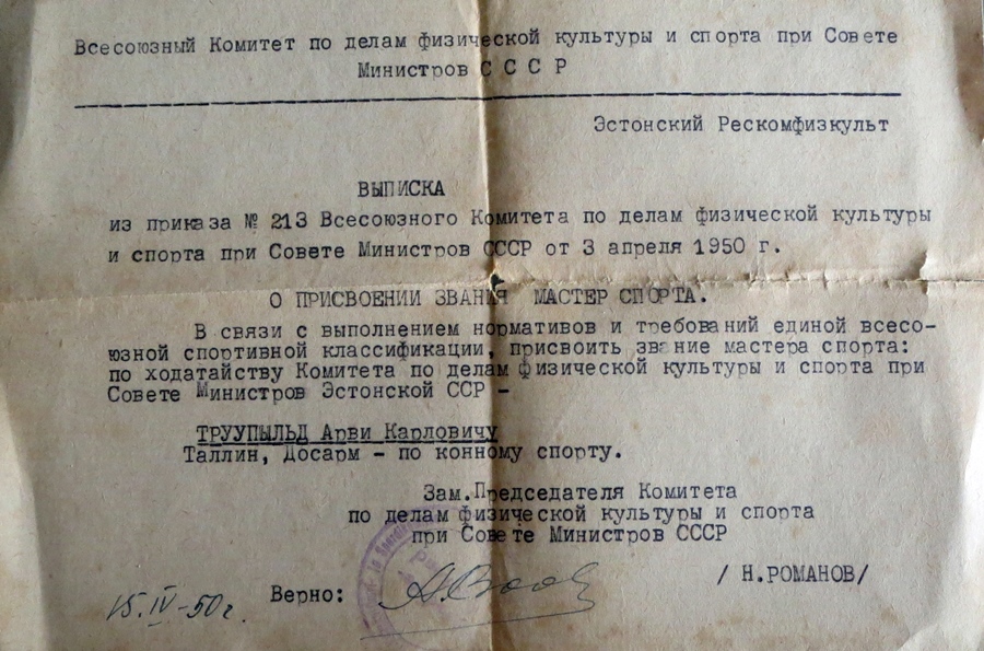 Arvi Truupõld oli Eesti NSV meister takistussõidus ja 1949.a. võitis NSVL meistritiili kahevoorulises takistussõidus. Samal aastal pälvis ta esimese Eesti ratsasportlasena NSVL meistersportlase nimetuse. Kahjuks kujunes tema sportlastee lühikeseks ja ta pühendus treenerina uute ratsasportlaste ettevalmistamisele.