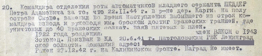 Peeter Põder. Pealetungi ajal vastasele Sõrve säärel, Kargi küla juures, asus rivist välja langenud komandöri asemele ja sai Vapruse medali. 921. Laskurpolgu võitleja, autasustamise hetkel nooremseersant. Autasude ajutised tunnistused on huvitavad ja üsna haruldased asjad... lisaks ka muid tunnistusi, näiteks haavatasaamise kohta 1943. aastal ja tõend välihospidalist. Medalit kahjuks ei ole.
