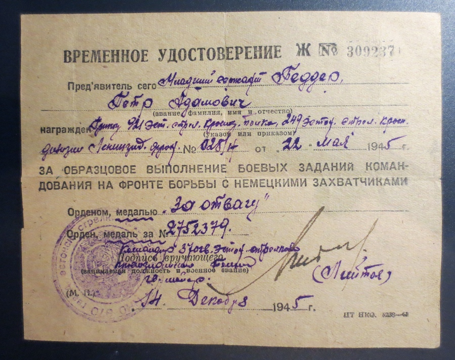Paberite hulgas on ka sõjaaegne (esmane) Punatähe ordeni tunnistus. Temale antud ordeni number oli 846877 ja sama teema 12. leheküljel olen paar aastat tagasi näidanud leitnant Edgar Nittimi Punatähe ordenit, mis oli numbriga 846878. Kiipuse orden oli juba varem rändama läinud - ehk õnnestub see kunagi dokumendiga jälle kokku viia.