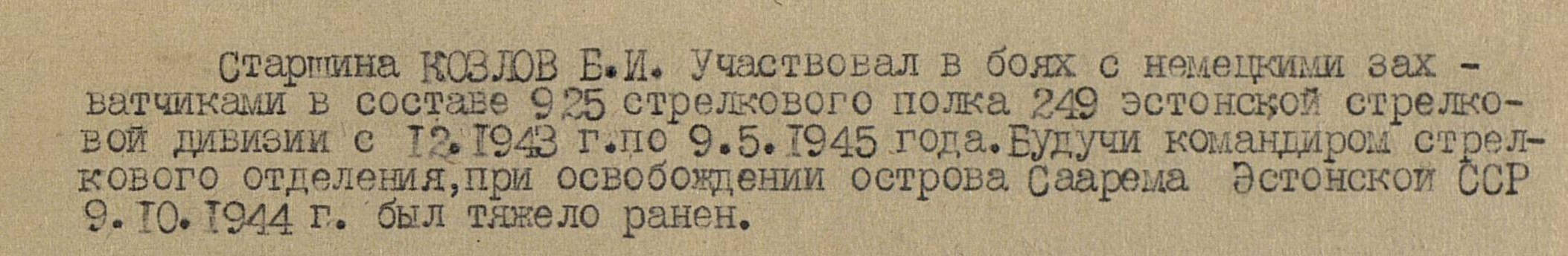 925. Laskurpolk, vanem Boris Kozlov. Vapruse medali nr. 3442417 kavaler, sai Sõrve sääre lahingutes 1944 aasta Septembris raskelt haavata.