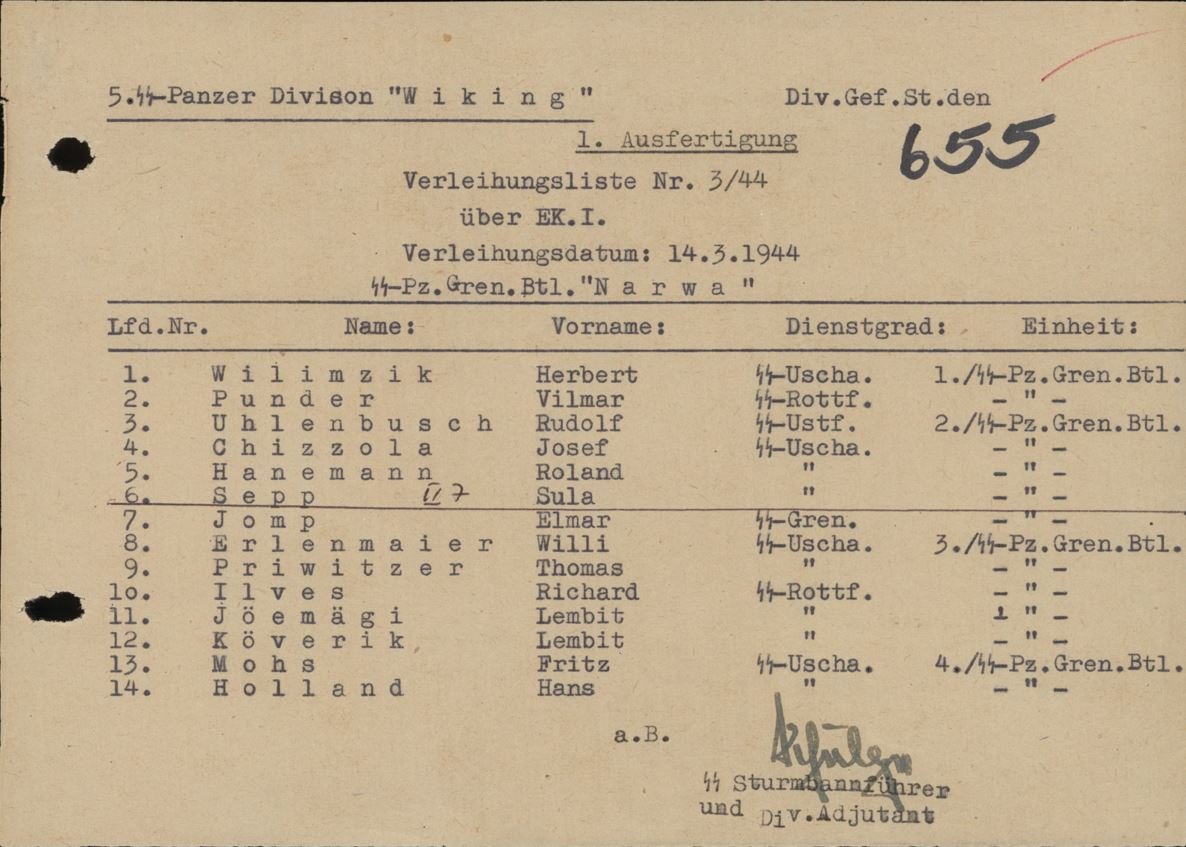 uscha kirjutas: T Okt 20, 2020 6:41 pm 888. Untersturmführer Ernst Kabrits - EK2 (3./SS-Pz.Gren.Btl. Narwa, EK2 14.03.1944)