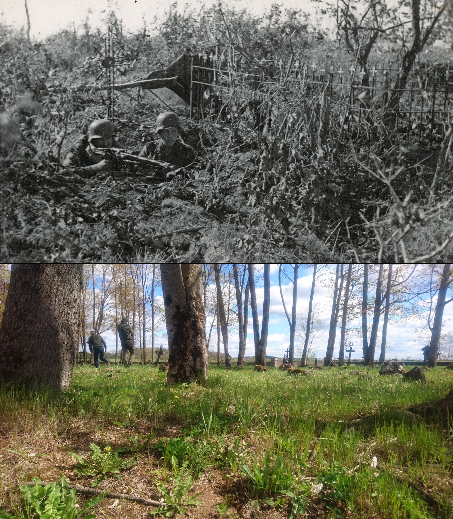 Alumisel pildil on vaade Vaivara kalmistult samas suunas, kuhu 1944. aasta ülesvõttel on sihitud kuulipilduja. Pildi keskel, väravaposti taga on näha Lastekodumägi ja vasakul Grenaderimäe lõunanõlv, pildistatud 2019. aasta mai alguses.
