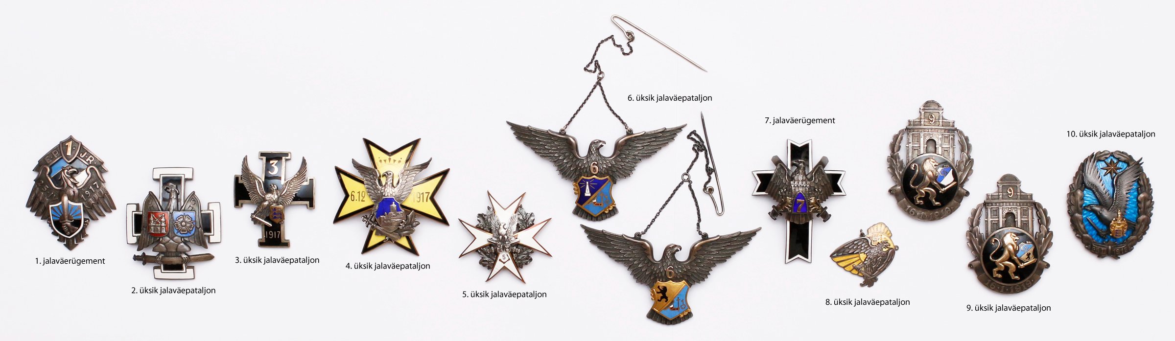 Enne 1940. aastat valmistatud Eesti kaitseväe numbriliste jalaväeüksuste rinnamärgid.