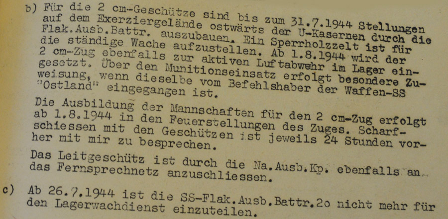 Päevakäsu tekstis on kokkuvõtlikult kirjas, et 31. juuliks olgu U-kasarmutest idapool asuval harjutusväljakul välja ehitatud 2 cm kahuri positsioon. Vahisõduri tarbeks on vaja püstitada puidust telk ja alates 1. augustist võtab 2 cm õhutõrjekahuri rühm aktiivselt osa laagri kaitsest. Rühma väljaõppe toimub rühma tulepositsioonil. Lahingmoonaga paugutamine on eelnevalt vaja kooskõlastada 20. tagavararügemendi ülemaga. Juhtkahur ( või kuidas on õige tõlkida Leitgeschütz ) on side väljaõppe kompanii poolt vaja ühendada telefonivõrku.