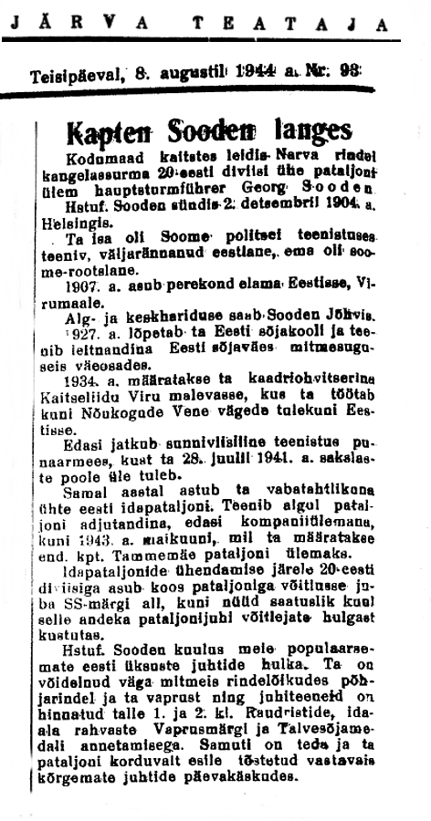 veel Soodeni langemisest Postimehes ja Järva Teatajas.