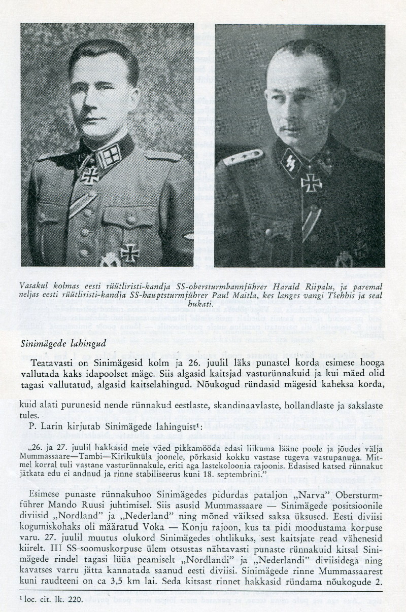 Teine oli alla kahekümnene poiss, kes igakord tulelöögi ajal jättis maha oma koha kaitsekraavi tulepesas ja hakkas varju otsima suuematest varjenditest, ise hüsteeriliselt karjudes: ”Ma saan pihta! Ma saan pihta!” Kuni ta ükskord leitigi surnult kompaniipunkri madalast jooksukraavist, mõni samm enne ukseava. Ei jõudnud kohale, aimus läks enne täide. Kuigi meie positsioon oli eesliinist mõnevõrra tagapool ja aktiivne lähivõitlus oma rünnakute ja vasturünnakutega enamasti siiani ei ulatunud, kandsime siiski peaaegu iga päev kaotusi. Üks valusamaid mulle isiklikult oli see, kui ühel hommikupoolikul pataljoni staapi minnes leidsin mäe küljel staabi sissepääsu lähedal langenuna oma sõbra ja klassivenna leitnant Arved Nõmme. Ta oli just äsja saanud mürsu- või miinikilluga raske kõhuhaava, surm oli ilmselt silmapilkne. Alles mõne päeva eest andis ta mulle oma ohvitserimütsi (kas ka see oli eelaimus?) ja vähem kui poolteist aastat tagasi olime istunud ühes koolipingis. Sõber Arved oli ka ainus ja viimane varasemast ajast tuttav poiss kogu Sinimägede lahingute ja edaspidiste sündmuste jooksul, kellega kokku juhtusin. Sellised asjad panevad isegi nooruki elu ja surma üle tõsiselt järele mõtlema. Hoolimata sellest et rindel on surm kohutavalt sage ja kohutavalt igapäevane asi, aga ikkagi…