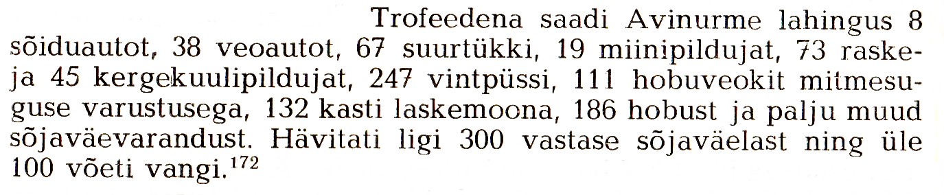 Tegelikult ei saa lahinguid üldse kergeteks ja rasketeks jagadagi. Kõik lahingud, nii väiksemad kui suuremad, on ühtviisi rasked. Lahinguid võiks tinglikult reastada tulemuste järgi. Nii nimetan meie polgu Eestimaa lahingutest kolme: Emajõe ületamist, Avinurmet ja Kuressaaret. Eriline koht neist oli Avinurmel, nii puht lahinguliselt tulemustelt kui sõjaliselt tähtsuselt. Lahing toimus 20 septembril 1944, sel päeval purustas meie s.t. üks polk kolm vaenlase jalaväe- ja suurtüki polku. Need olid 19. septembril taandumisplaani „Aster“ järgi Narva alt tagasi tõmmatud Saksa väed, kes kottijäämise vältimiseks liikusid esiotsa üsnagi takistamata lõuna poole. Meie teene oli selles, et hulk elavjõudu ja tehnikat ei jõudnud lõunapoolsetele väegrupeeringutele appi minna.