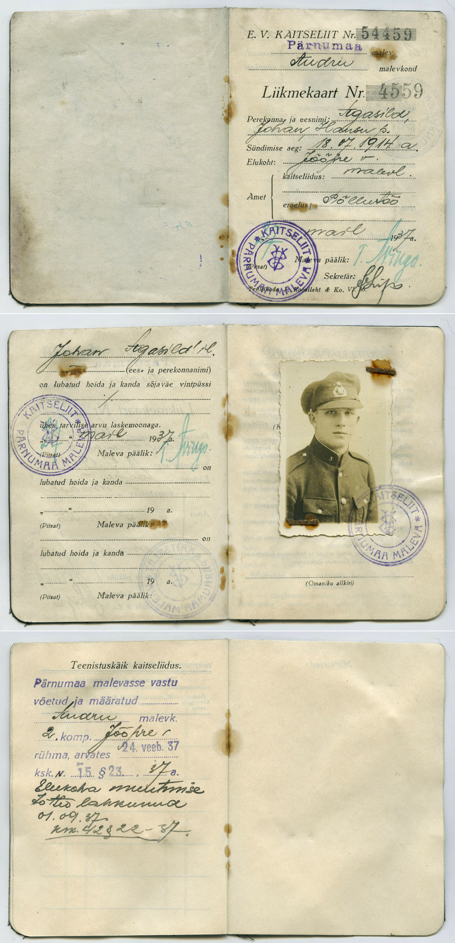 Pärnumaa maleva Audru malevkonna 2. kompanii Jõõpre rühma koosseisu kuulunud Johan Agasild'i KL liikmekaart.