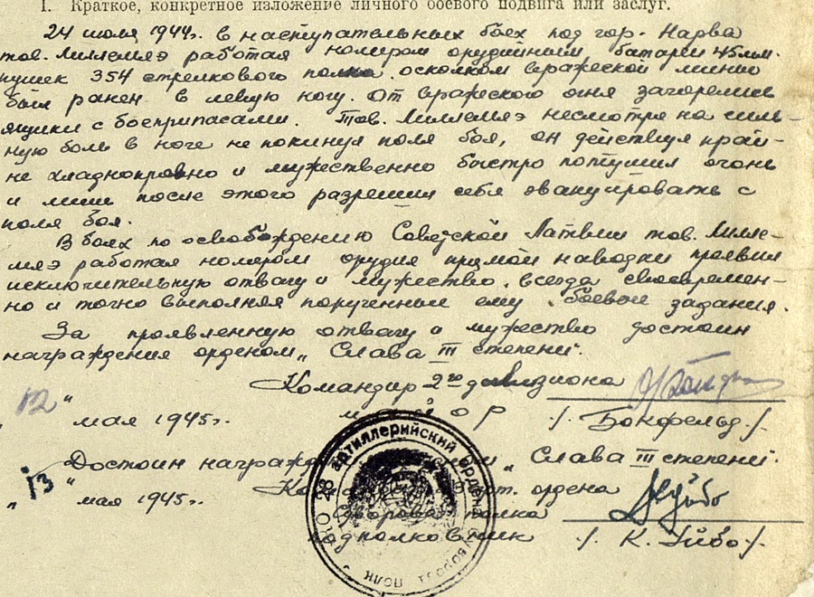 Nüüd aga Kindralleitnant Lembit Pärna allkirja kandev tunnistus medalile Võidu eest Saksamaa üle. Medali on saanud kaardiväe vanemleitnant Friedrich Bek.