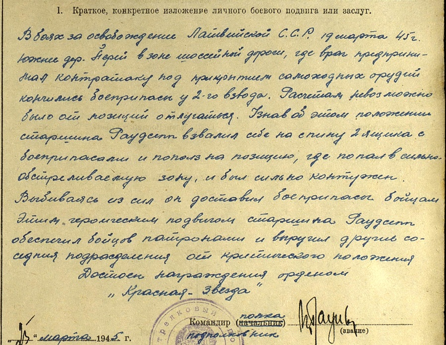Punatäht saadud Kuramaa lahingutes, kus päästis kriitilise olukorra viies turmtule all eesliinile laskemoona ja sai põrutada...
