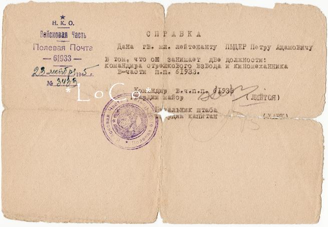 Dokument selle kohta, et mees on tegev kahel ametipostil - rühmaülemana ja kinomehhaanikuna. 23.nov.1945.a.