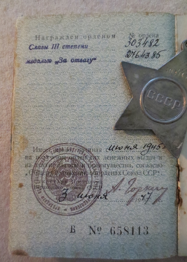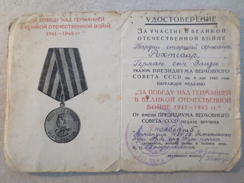 484. Kaardiväe Eesti Suurtükiväepolgu kaardiväe vanemseersant Herman Rohtsaare autasud. Kahjuks on Vapruse ja Lahinguteenete medalite dokument kadunud, kuid medalid on tema omad.
