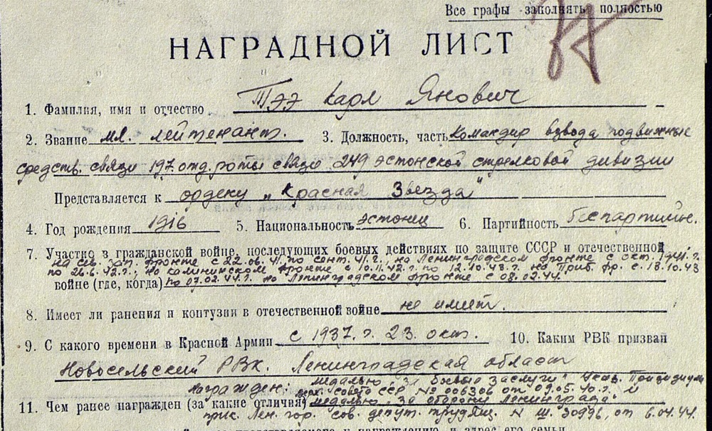 Täna kokkutulekult saadud Punatäht 582364. Ordeniga oli kaasas legend, et selle on autasustatud keegi Tee nimeline, kelle isanimi oli Jaan. Ja tõesti, leidsin sellise autasustamise, mis sobib ka ajaliselt ordeni numbriga. Niisiis, üsna kindlasti on ordeni kavaleriks Karl Tee, Jaani poeg.