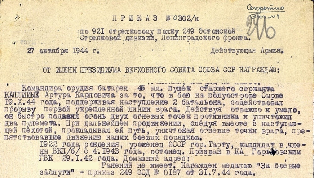 925. lp jefreitor Aleksei Truu. Saaremaa mees. Vapruse medal saadud 1944. a novembris Sõrve sääre lahingutes ülesnäidatud vapruse eest, Kuulsuse orden 363370 aga 1945. aastal ja haavata saamiste eest. Truu sai kolm korda haavata- raskelt 30.12.1942 Velikije- Luki all, kergemalt 19.19.1944 kodumaa pinnal toimunud lahingutes ja taas raskelt 19.03.1945 Kuramaal...