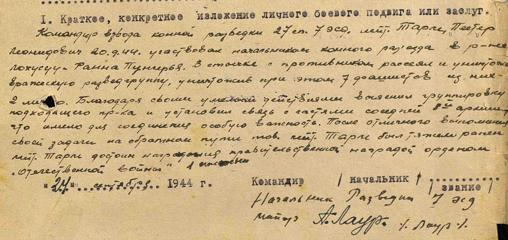 7. Laskurdiviisi, 27. Laskurpolgu ratsaluure rühmakomandor Peeter Tarm täitis 20.09.1944 oma rühmaga Lohusuu- Rannapungerja rajoonis luureülesannet. Kokkupõrkes lõid nad laiali ja purustasid vastase luuregrupi, hävitades 7 fashisti- Tarm hävitas neist 2 isiklikult.