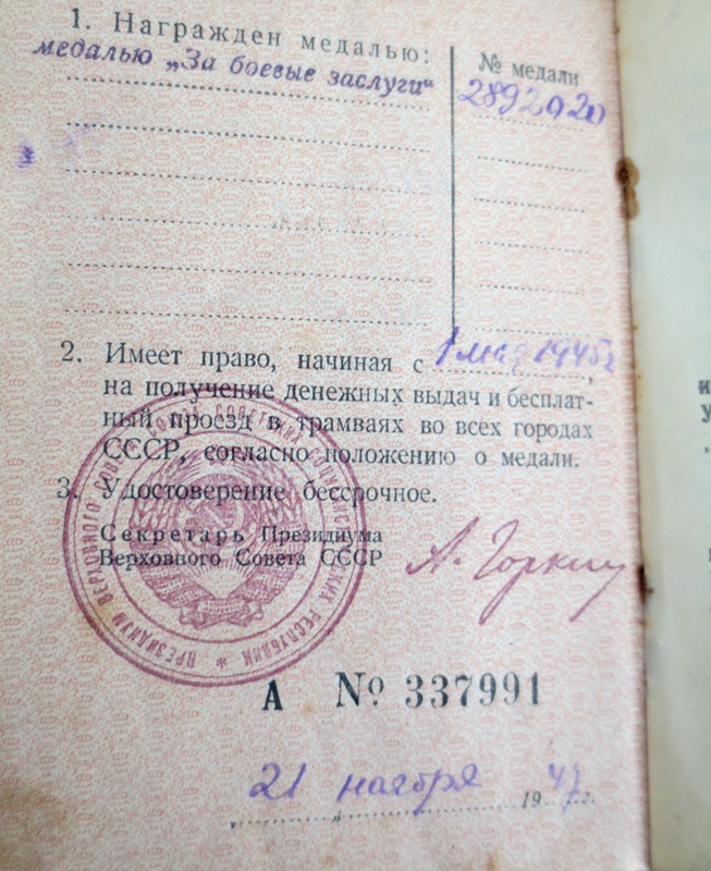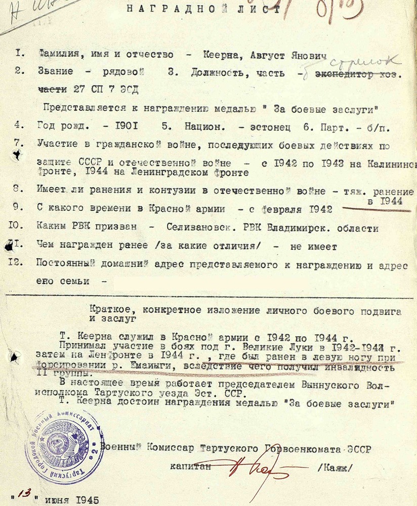 Lahinguteenete medali ajutise tunnistuse vahetas ta punakaanelise dokumendi vastu mingil põhjusel välja alles 1954. aastal. Medal ‘’Võit Saksamaa üle’’ on antud välja NKVD Balti mereväeehituse ehituspataljonide valitsuse poolt.