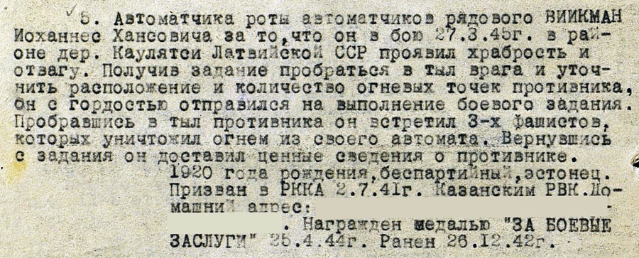 300. laskurpolgu automaatur Johannes Viikman on autasustatud peale piltidel näha oleva Lahinguteenete medali nr. 1 160 919 veel ka Vapruse medaliga ja seda Kuramaa lahingute eest. Vapruse medali autasulehe leidsin, aga medalit ennast ei ole. Lahinguteenete medaliga on teda autasustatud 25.04.1944, kuid autasulehte ma hetkel leida ei suutnud:) Vapruse medali autasulehest selgub ka, et ta on saanud 26.12.1942 haavata, ilmselt juhtus see Velikije-Luki lahingute ajal.