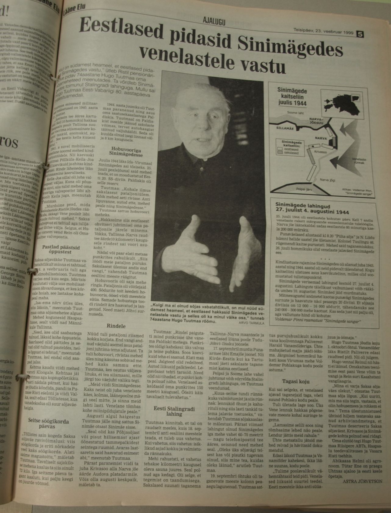 A. Toomsalu: “Käisin ise paaril korral tagalast täiendust toomas. Noored 17- 18 aastased poisid olid juba paari päeva möödudes selles tapatalgus, kus polnud õhku hingamisekski, nagu kaheksakümnesed vanakesed. Ei tundnud neid enam äragi. Näod kõigil ühtemoodi mustad, habetunud.” Peale kerget haavatasaamist võttis sidumispunkti arst Arno endale abiliseks. Sinimägede lahingus tulistas Arnogi oma tankirusikast puruks ühe nn. surnud T- 34 tanki ja sai selle eest tasuks paki sigarette.