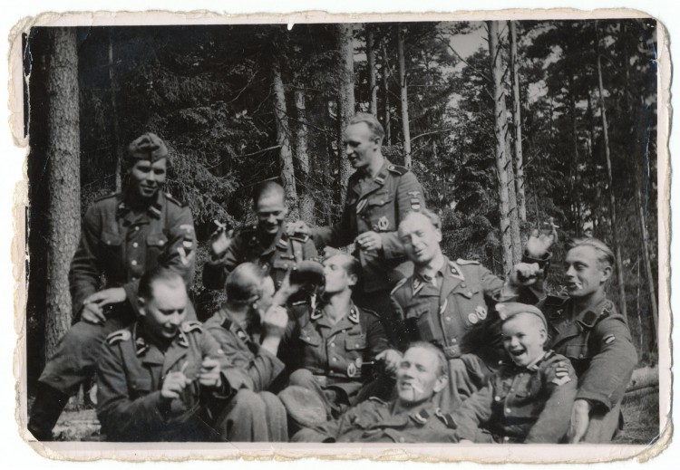Enamik fotol olevatest meestest on mingit sorti paelamehed ja vormikuubedest ning autasudest on aru saada, et tegemist on endiste Idapataljoni sõduritega. Ainukesena eristub teistest parempoolne mees, kelle taskupealne paistab olema tühi ja auaste kõigest Grenadier - äkki üks kevadistest mobiliseeritutest? Nimeliselt on teada ees paremal istuv polgupoeg Avo Põdra, taga keskel seisab Johan(nes) Ringo ja suitsetav Grenadier peaks olema Leo Kuusik.
