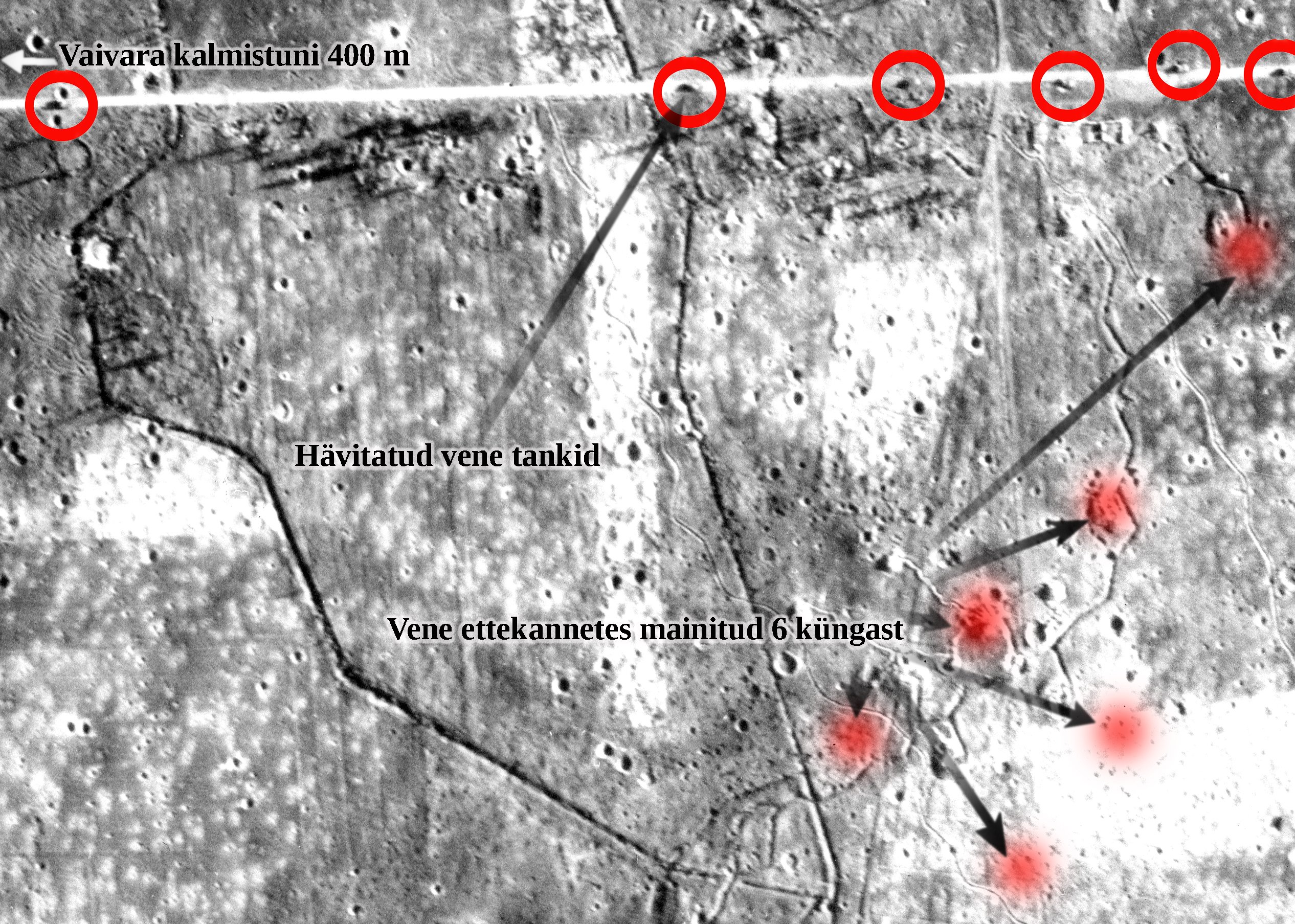 Punaste ringidega on märgitud 45. tankipolgu lahinguväljale jäänud tehnika. Hundinurgast läände suunatud rünnaku esmane siht oli jõuda kuue künkani. Nagu fotolt näeme, see ülesanne ka täideti.