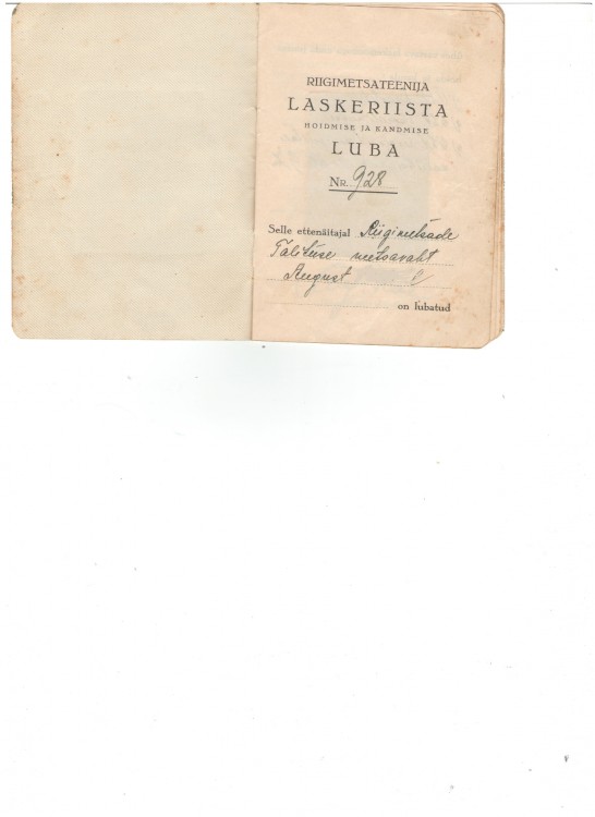 Mul on alles mu vanaisa "Riigimetsateenija laskeriista hoidmise ja kandmise luba." Seal on kirjas isikule lubatavad relvad - antud juhul lubati hoida ja kanda üht haavlipüssi, üht sportpüssi ning üht revolvrit või püstolit kaliibriga mitte üle 9 mm. Mis seaduse või käsukirjaga need kehtestati, ei oska öelda. Samasse dokustaati on kantud nii eraomanduses olevad kui ka riigi poolt antud relvad, samuti on märge punapöörde järgselt relvade äravõtmise kohta.